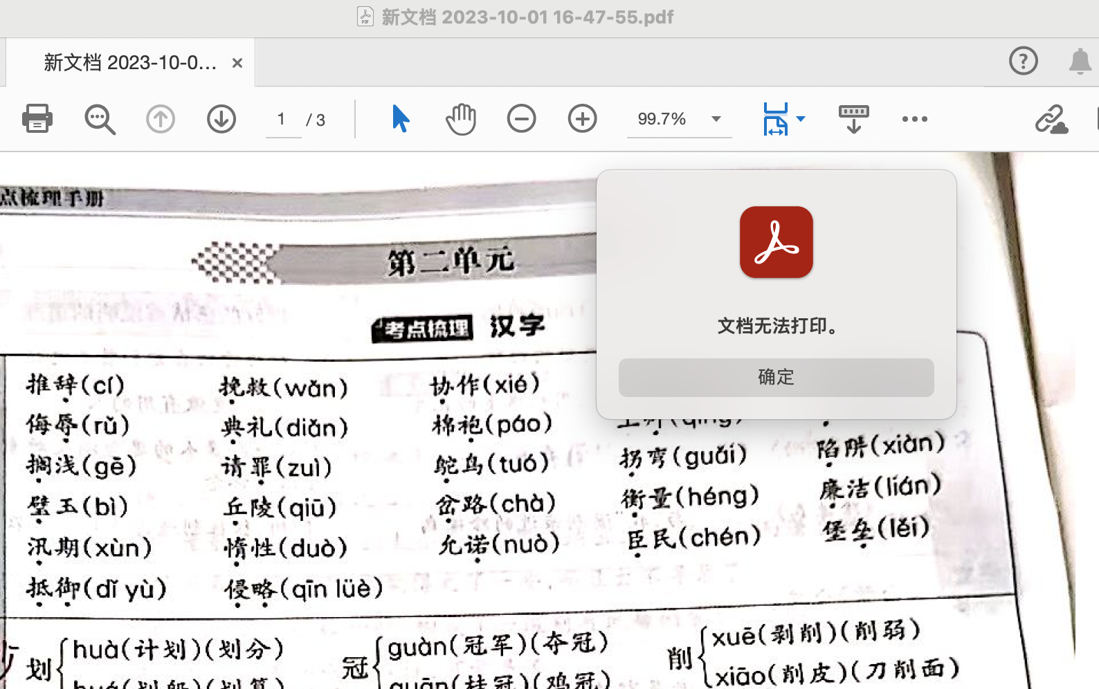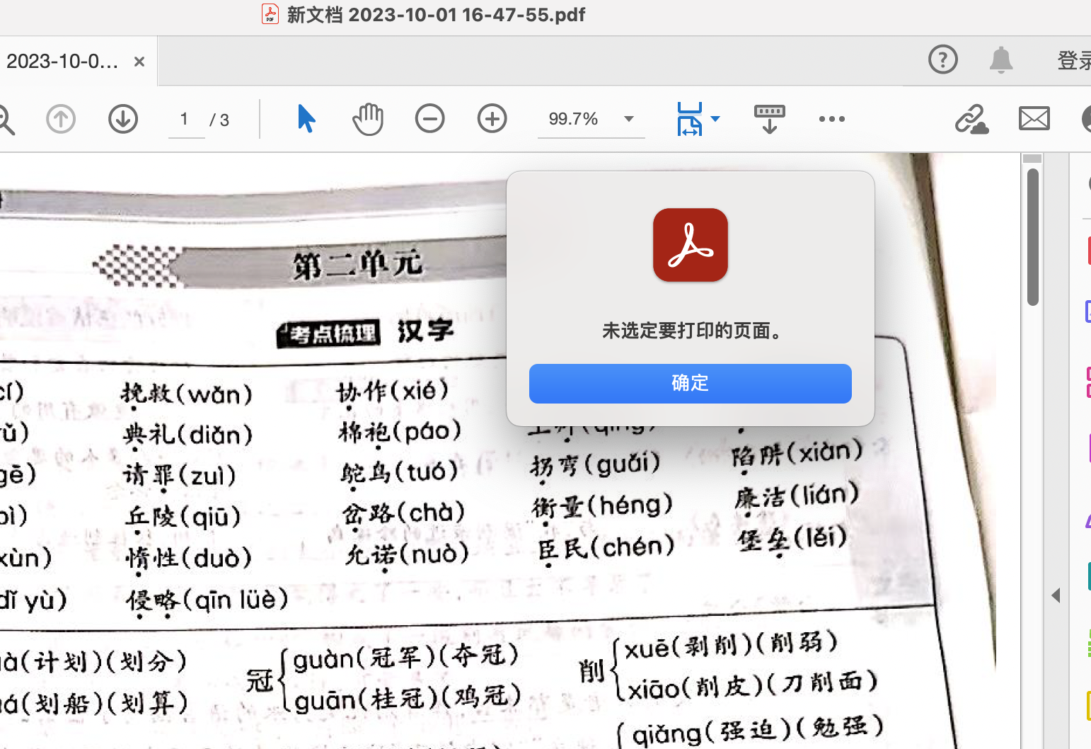 MacOs14,打印acrobat的pdf文件显示“文档无法打印”和“未选取打印页面”。
