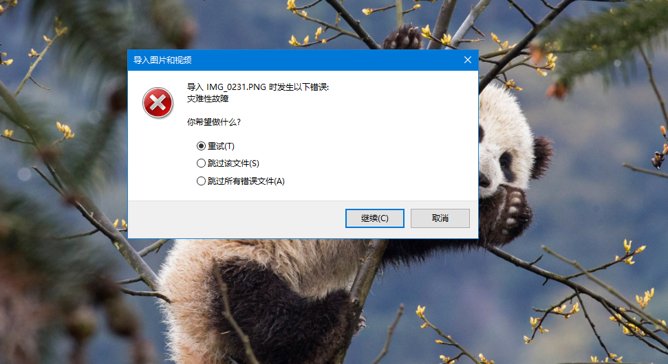使用Windows原生的“导入照片和视频选项”来导入我的iPhone中的照片,结果出现了连续数百张照片出现了“灾难性故障”,无法导入,跳过了这数百张照片,后面的一些照片虽然可以导入,但也夹杂着无法导入的内容,再次尝试导入那些“灾难性故障”的内容仍然无法导入。