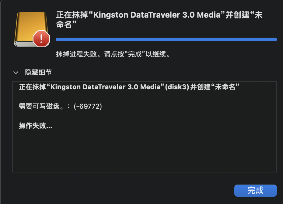 MacBook Pro 15″ 优盘无法格式化,显示需要可写磁盘。:(-69772)
