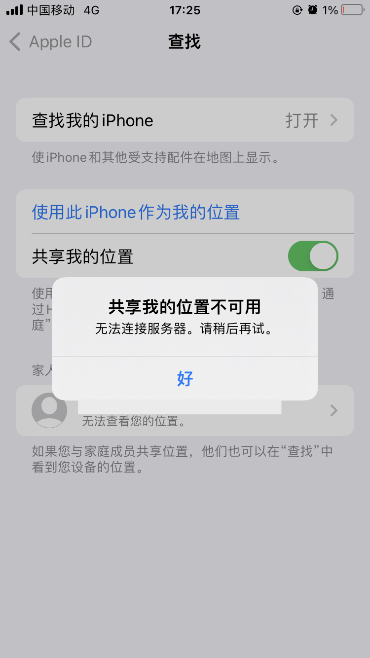 查找 无法显示其他设备,提示共享我的位置不可用无法连接服务器。请稍后再试