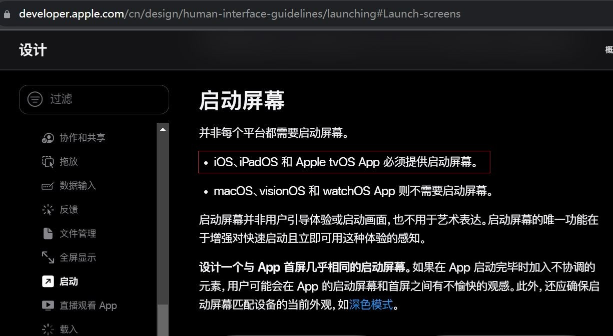 iOS 平台设计发布的 App 是必须带有启动屏幕的(Apple来源开发者指南网站,见下图)。