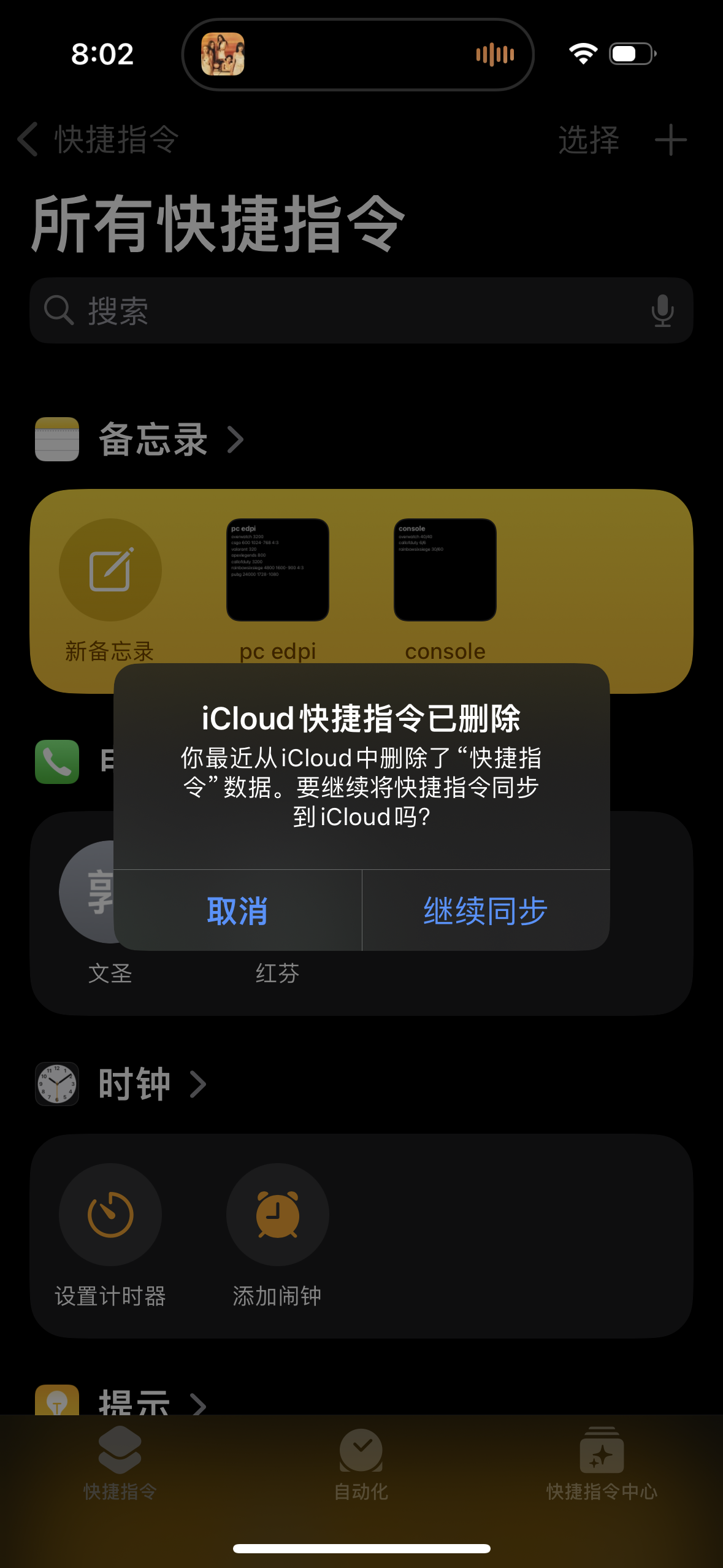 在旧手机的icloud中删除快捷指令后,新手机快捷指令无法同步iCloud,每次打开快捷指令都会有下图的弹窗,点了继续同步无法同步,下次打开依然弹出