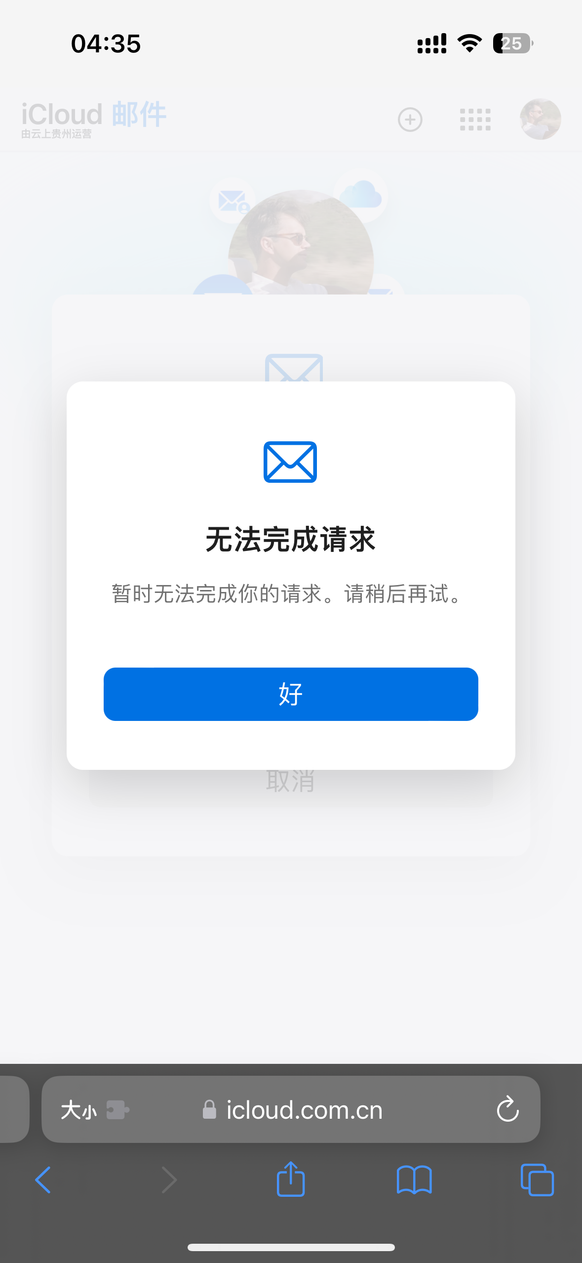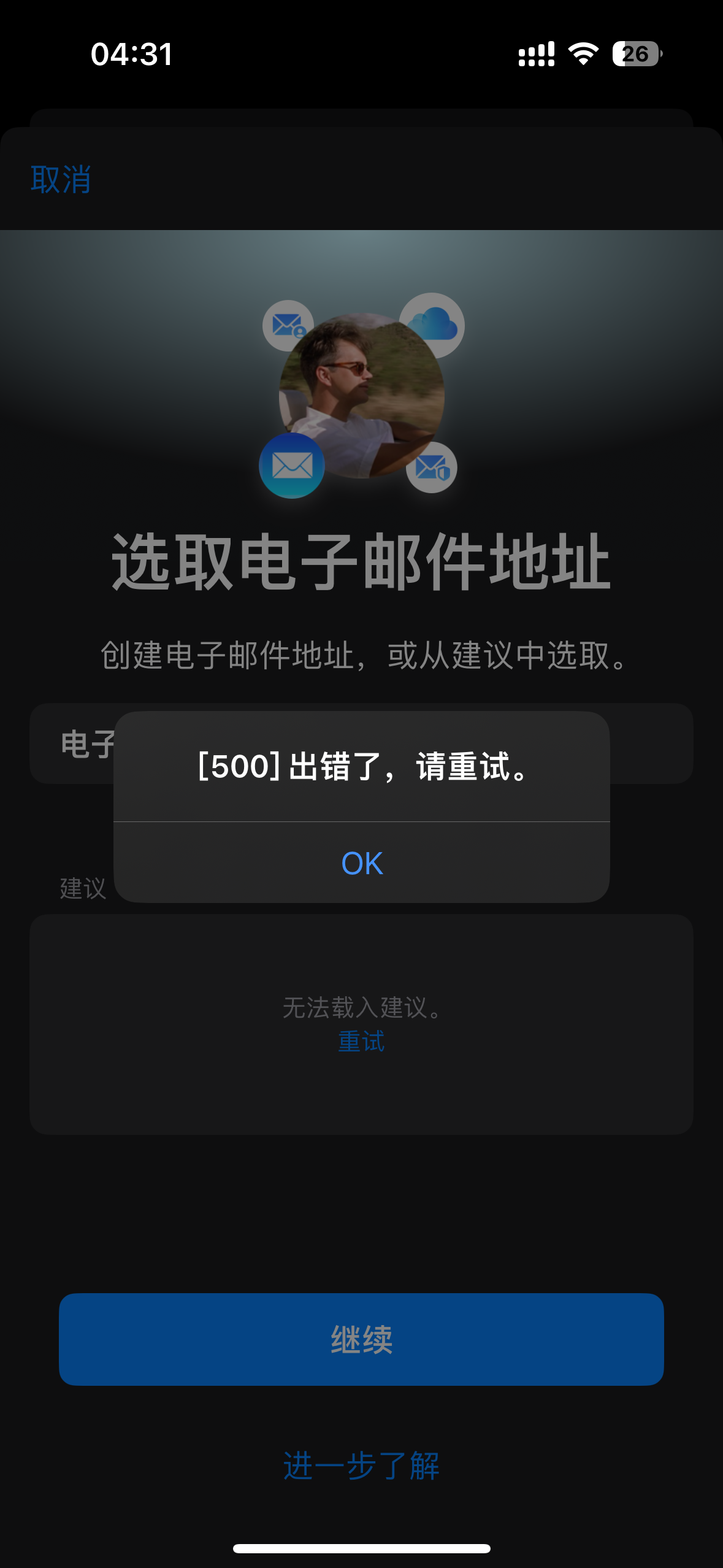 这个Apple ID之前没注册过iCloud邮箱,今天想创建个邮箱地址结果不行,提示“出错了,请重试”,登上iCloud.com.cn一样注册不了,这是什么原因