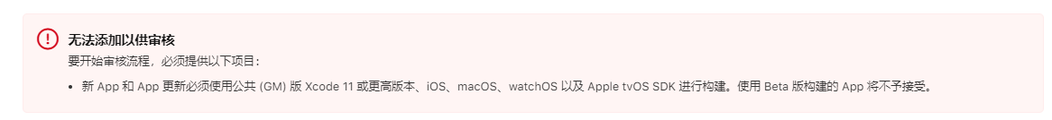 - 新 App 和 App 更新必须使用公共 (GM) 版 Xcode 11 或更高版本、iOS、macOS、watchOS 以及 Apple tvOS SDK 进行构建。使用 Beta 版构建的 App 将不予接受。