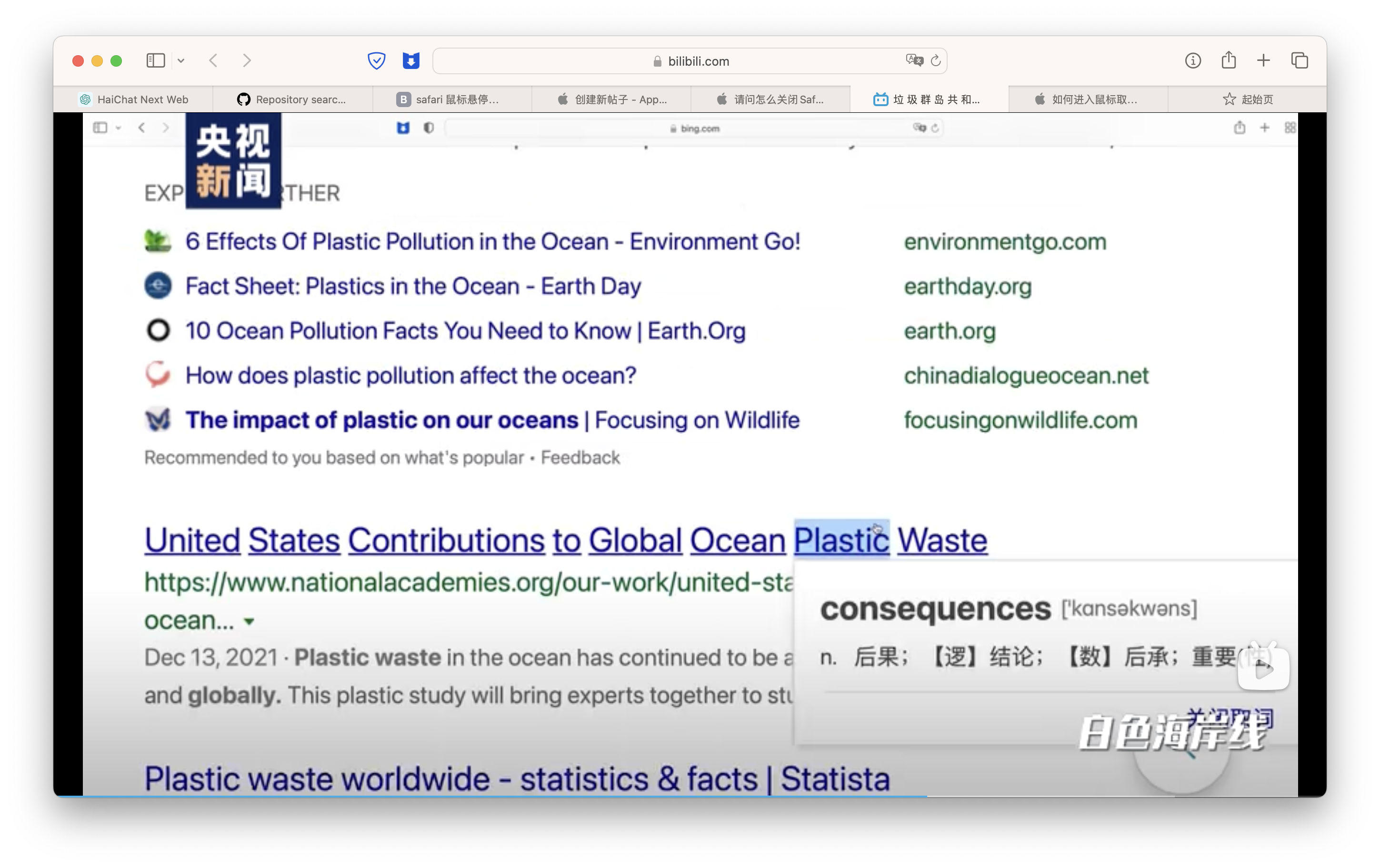 在学习Mac快捷键的时候,也不知道误按了什么组合键,突然发现鼠标指针移到Safari网页上的英文单词上,就会有小窗口自动显示英文单词的中文翻译,不需要按任何按键(不需要三指轻点)。在出现的小窗口右下脚有个蓝色的“退出取词”选项,点击后,自动翻译窗口就不再出现了,难道是safari插件?