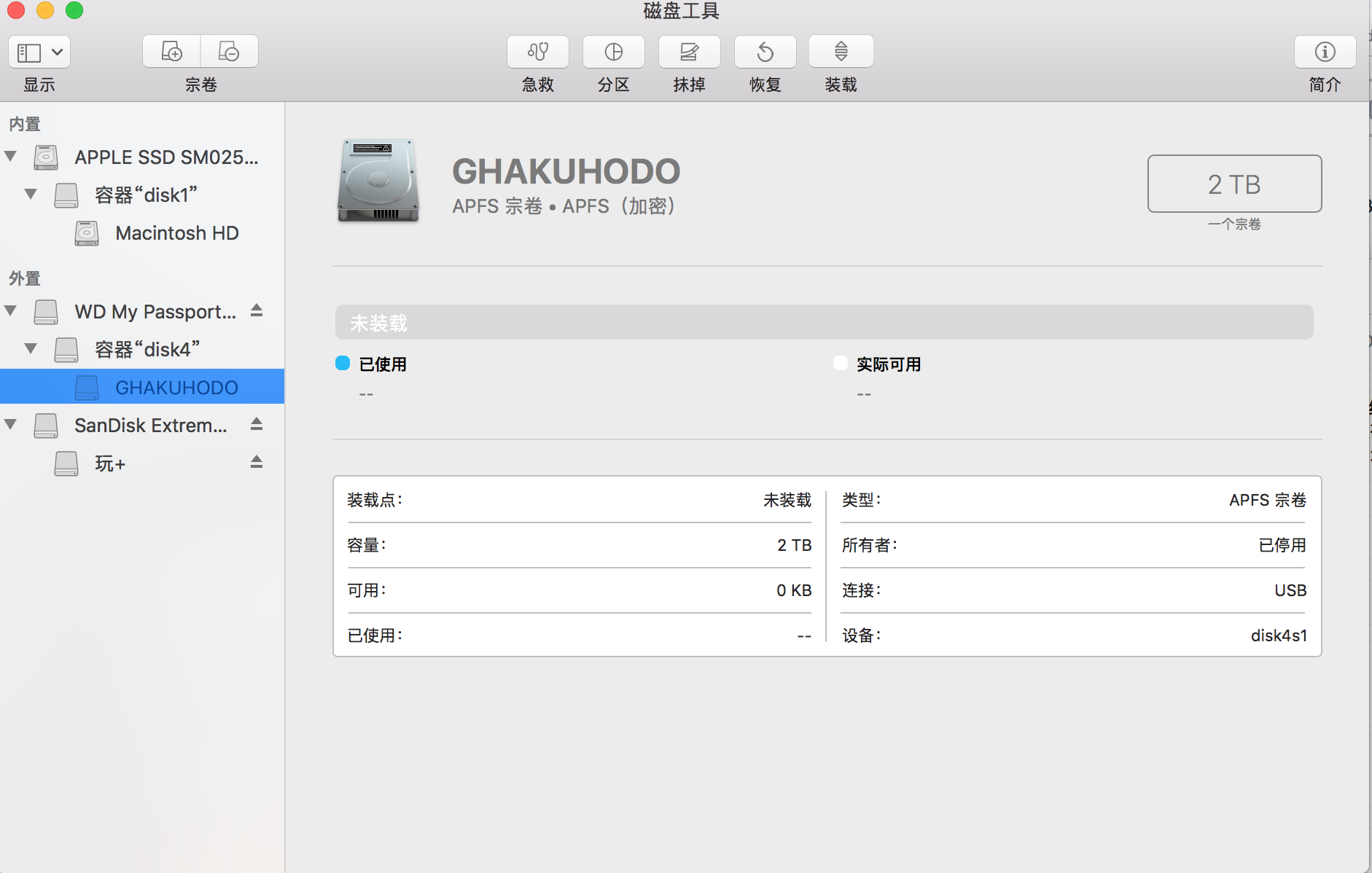 移动硬盘的磁盘工具里面显示是灰色的。示意:APFS 宗卷. APFS(加密)状态