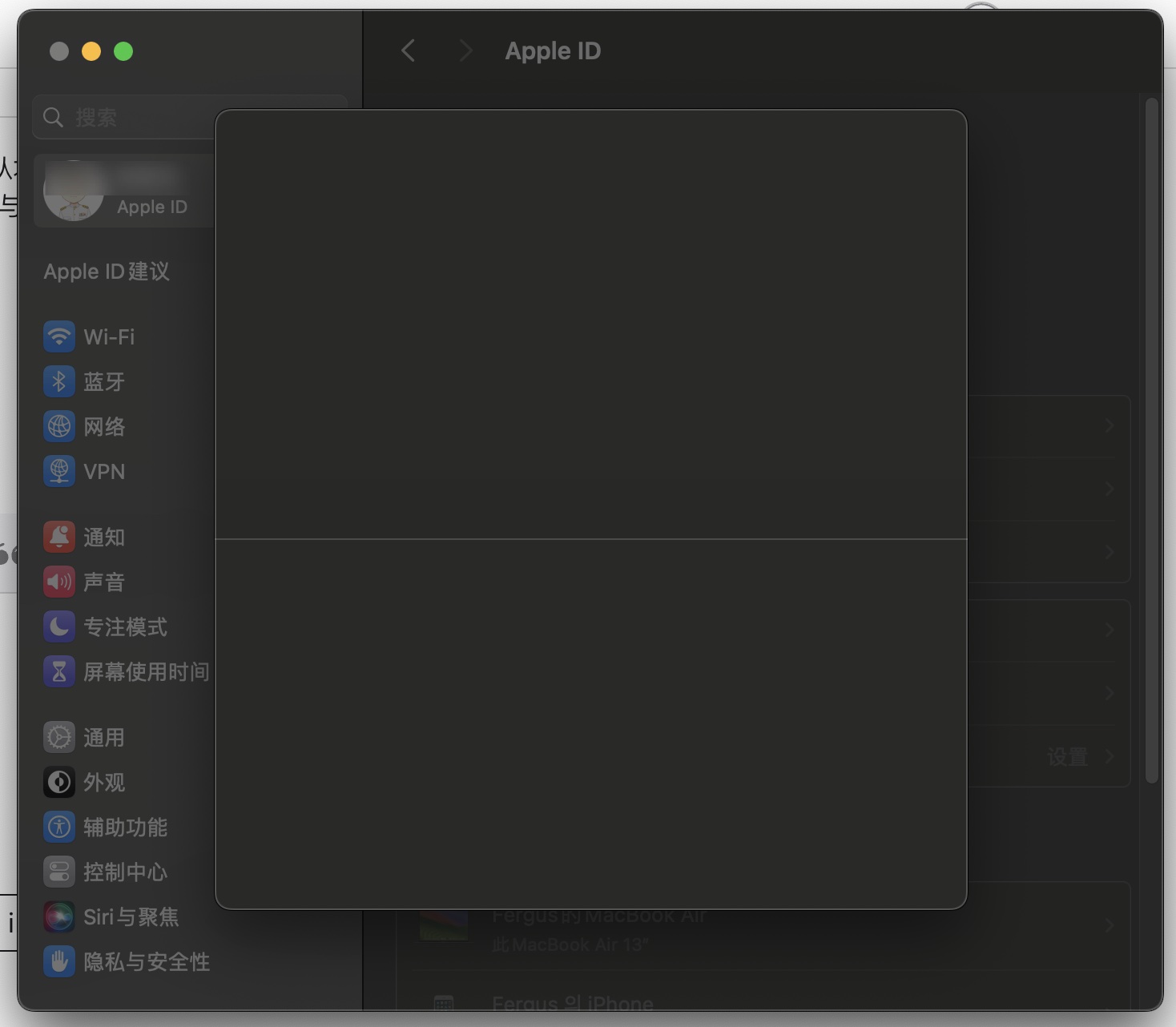 然后打开Apple ID 建议后,点击“条款与条件”之后,弹出窗口就卡住了,不出现内容。还无法关闭。应该怎么办?