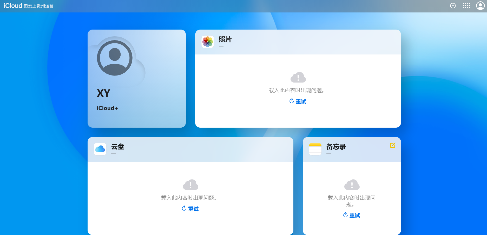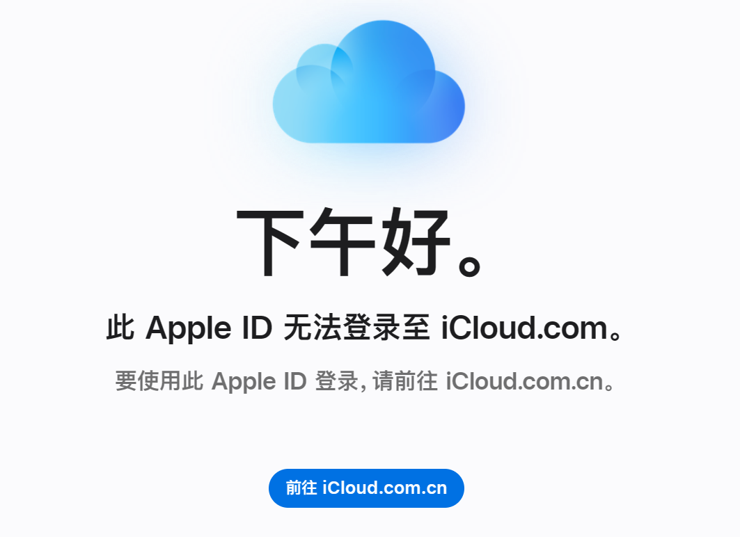 随后我尝试登录iCloud.com,输入帐号密码后显示“此Apple ID无法登录至iCloud.com,要使用此Apple ID登录,请前往iCloud.com.cn”,随后我重复登录iCloud.com.cn,依然显示“载入此内容时出现问题”。
