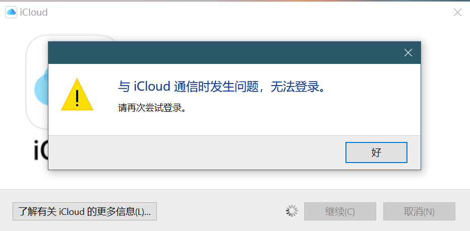 最后我通过Microsoft Store下载windows版的iCloud,在输入Apple ID和密码后,我输入了显示在iPad上的验证码,加载过后显示“与iCloud通讯时发生问题,无法登录,请再次尝试登录。”