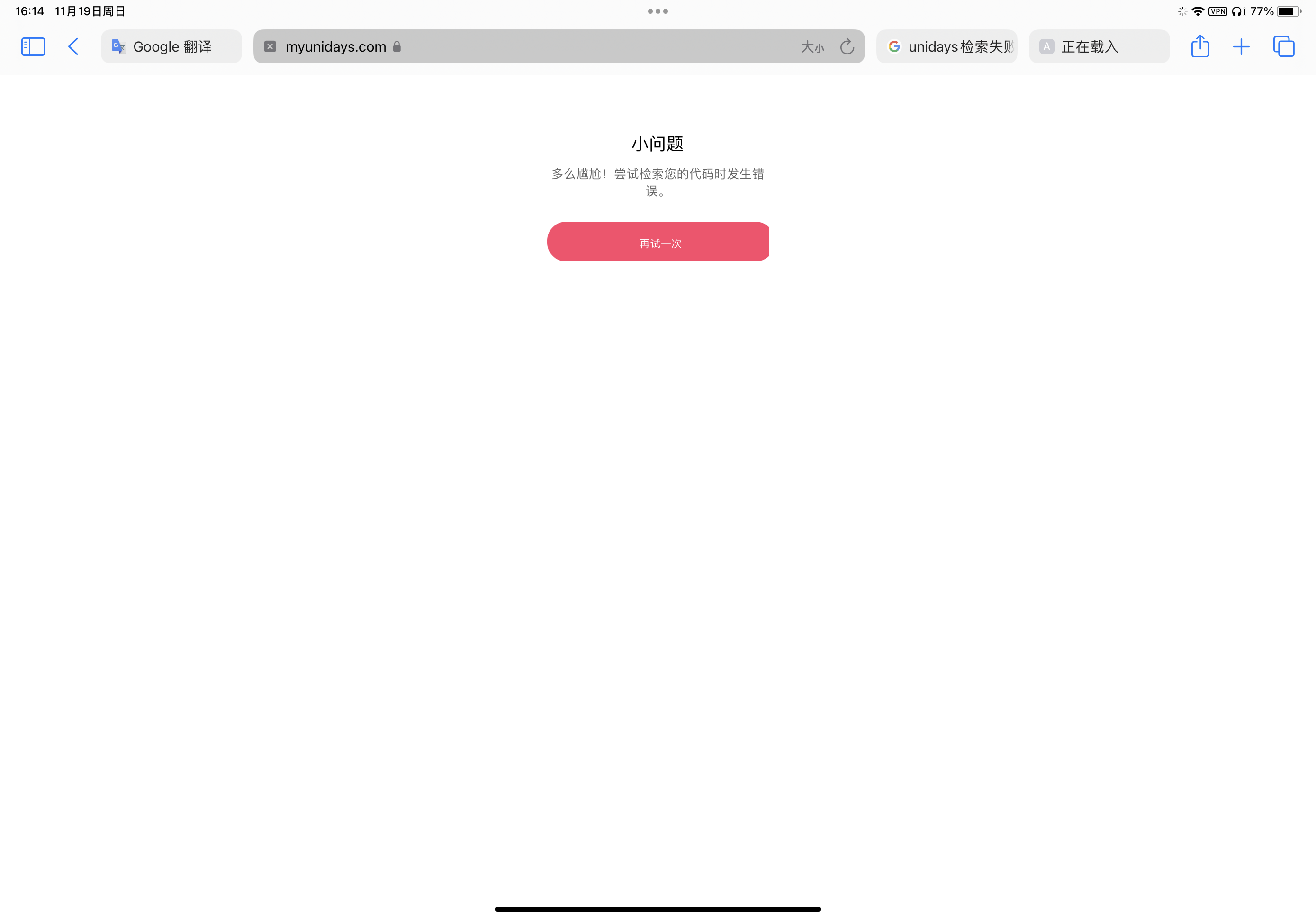 然后重新订阅时链接到Unidays网页就会出现“小问题 多么尴尬!尝试检索您的代码时发生错误。”