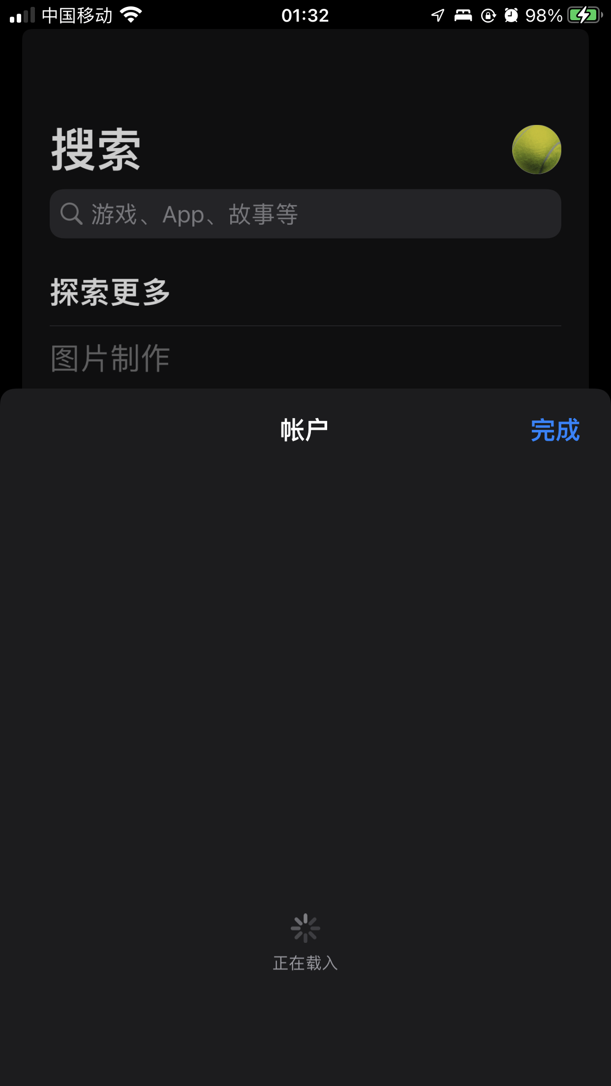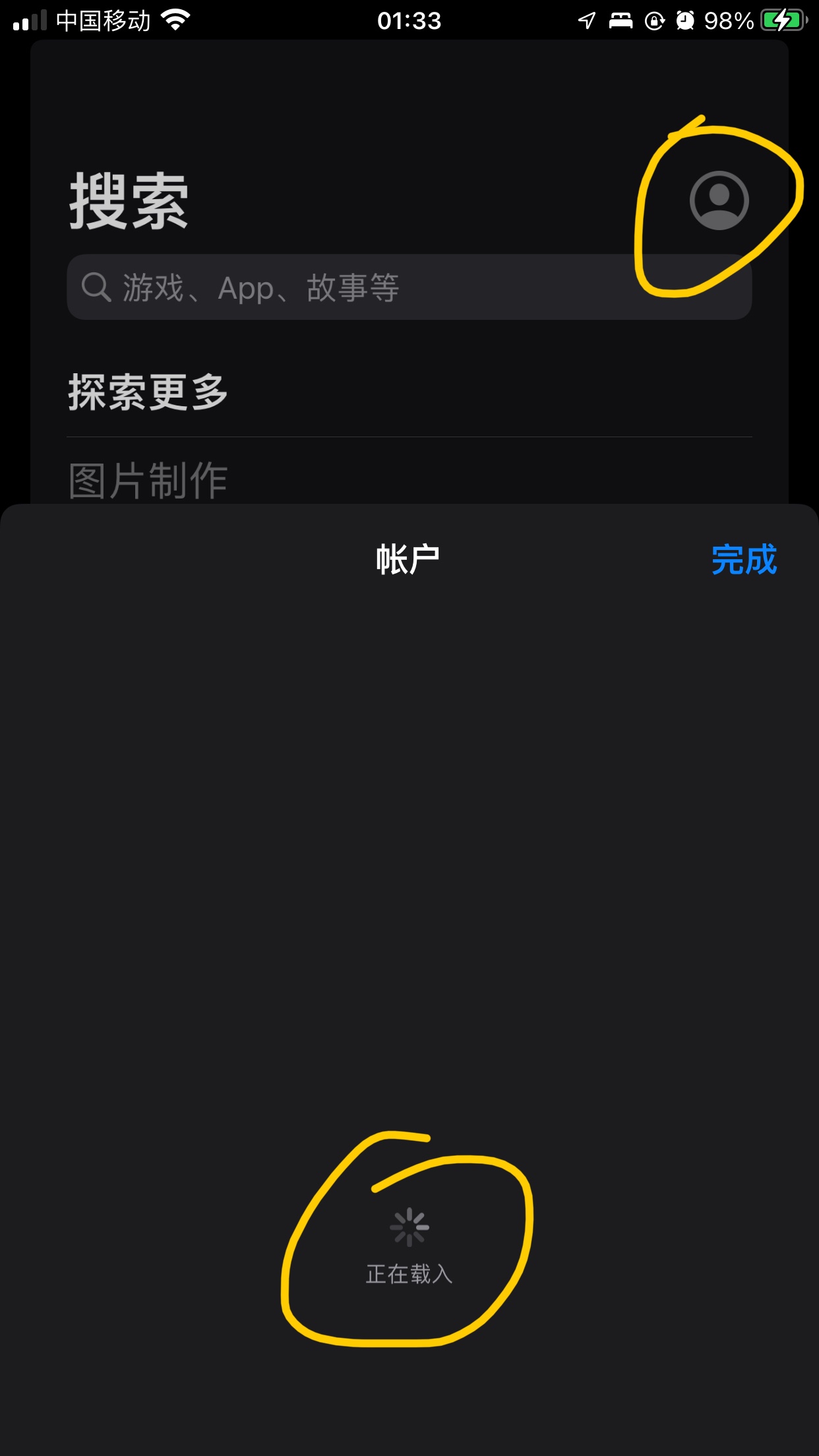 AppleID-的(媒体与购买项目)无论登录还是关闭账户,在App Store里点击右上角的账户时,总是显示“正在载入”。因此,也无法下载或更新app。