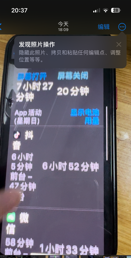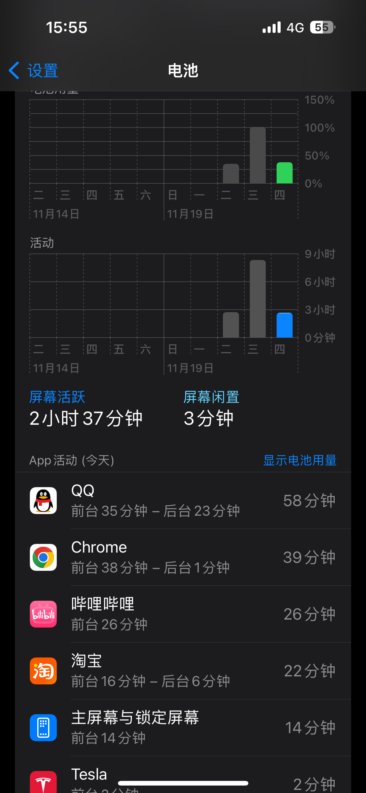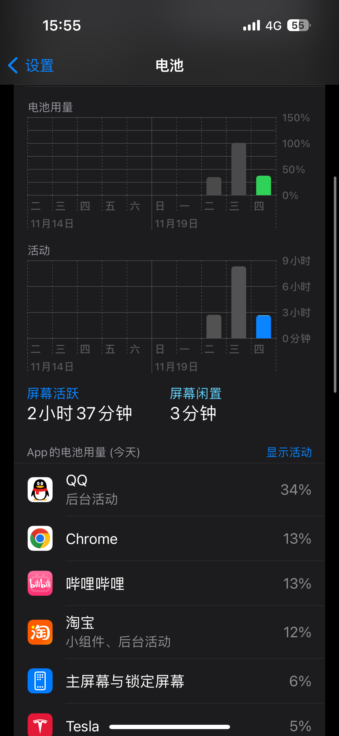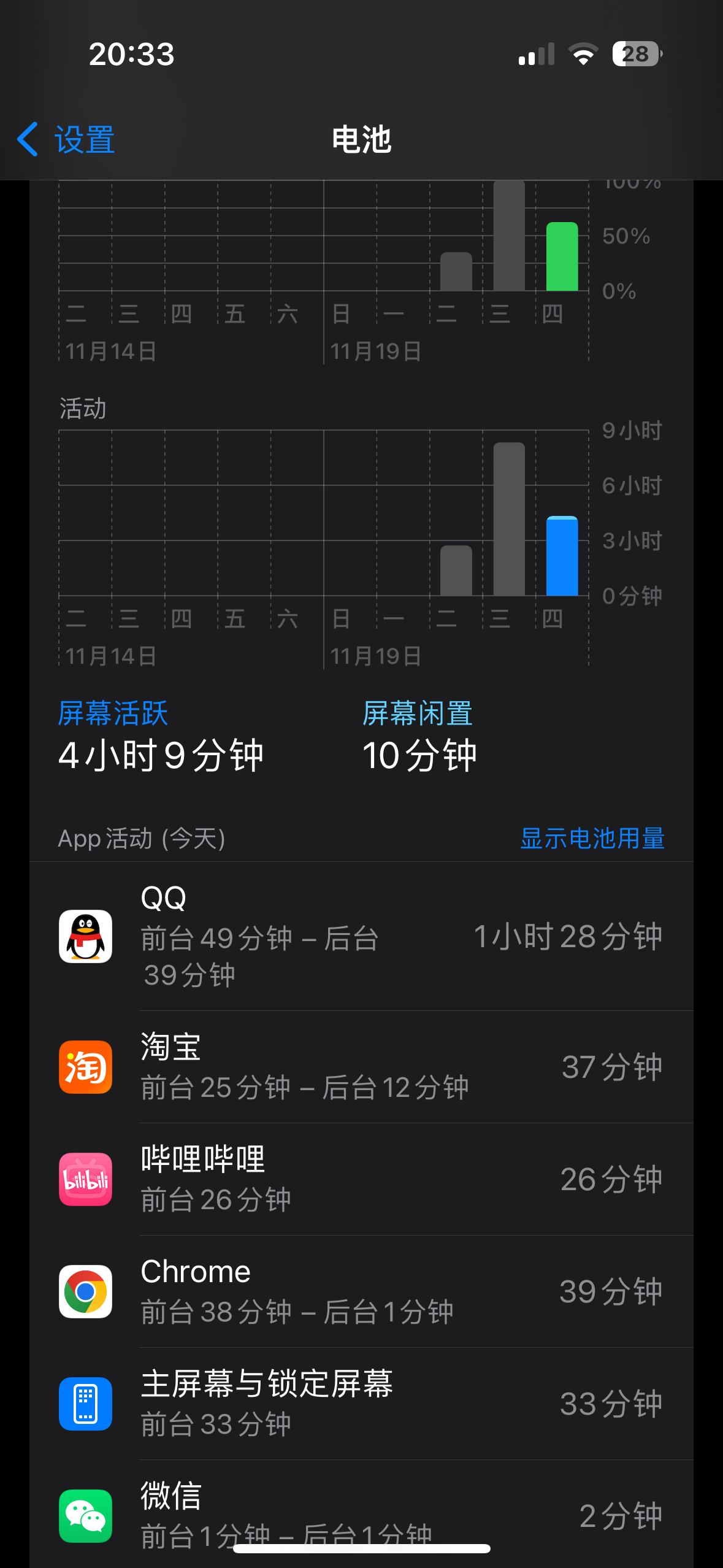 即使是这样的轻度使用,聊聊qq(没有涉及到语音等)上网查资料,开了下淘宝和b站,在这35+38+26+16的接近2个小时里用掉了我将近总电量40%的电量,同时我是到手就关闭了部分程序的后台刷新和熄屏状态常量这两个功能的,现在让我感觉非常头疼的就是过一会手机有消息了,我看一眼手机,电量又掉了的这种感觉