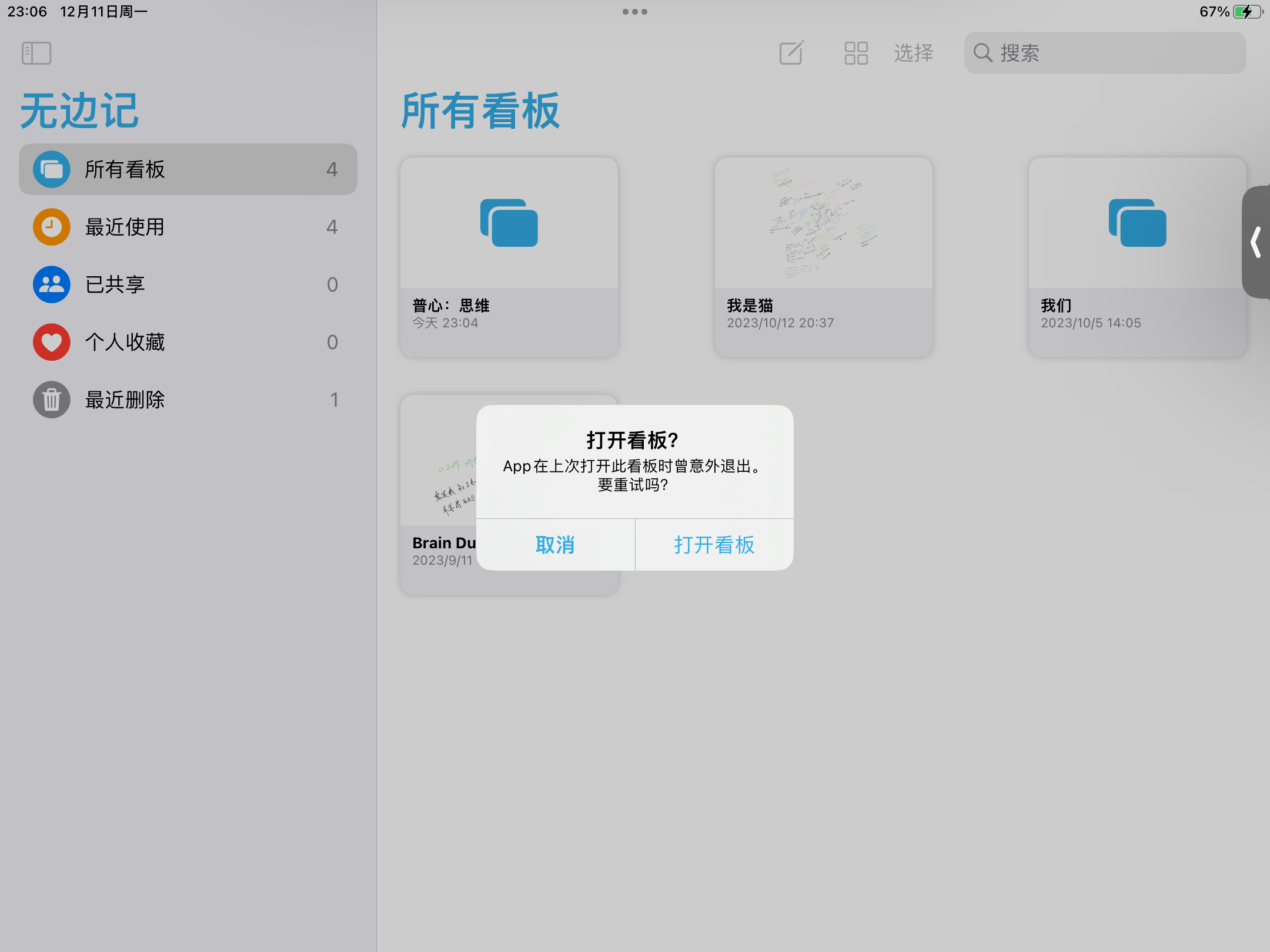 如图,点击预览图是文件夹图案的白板后会跳出这个提醒,但点击打开看板后会继续卡顿在这个页面没有反应