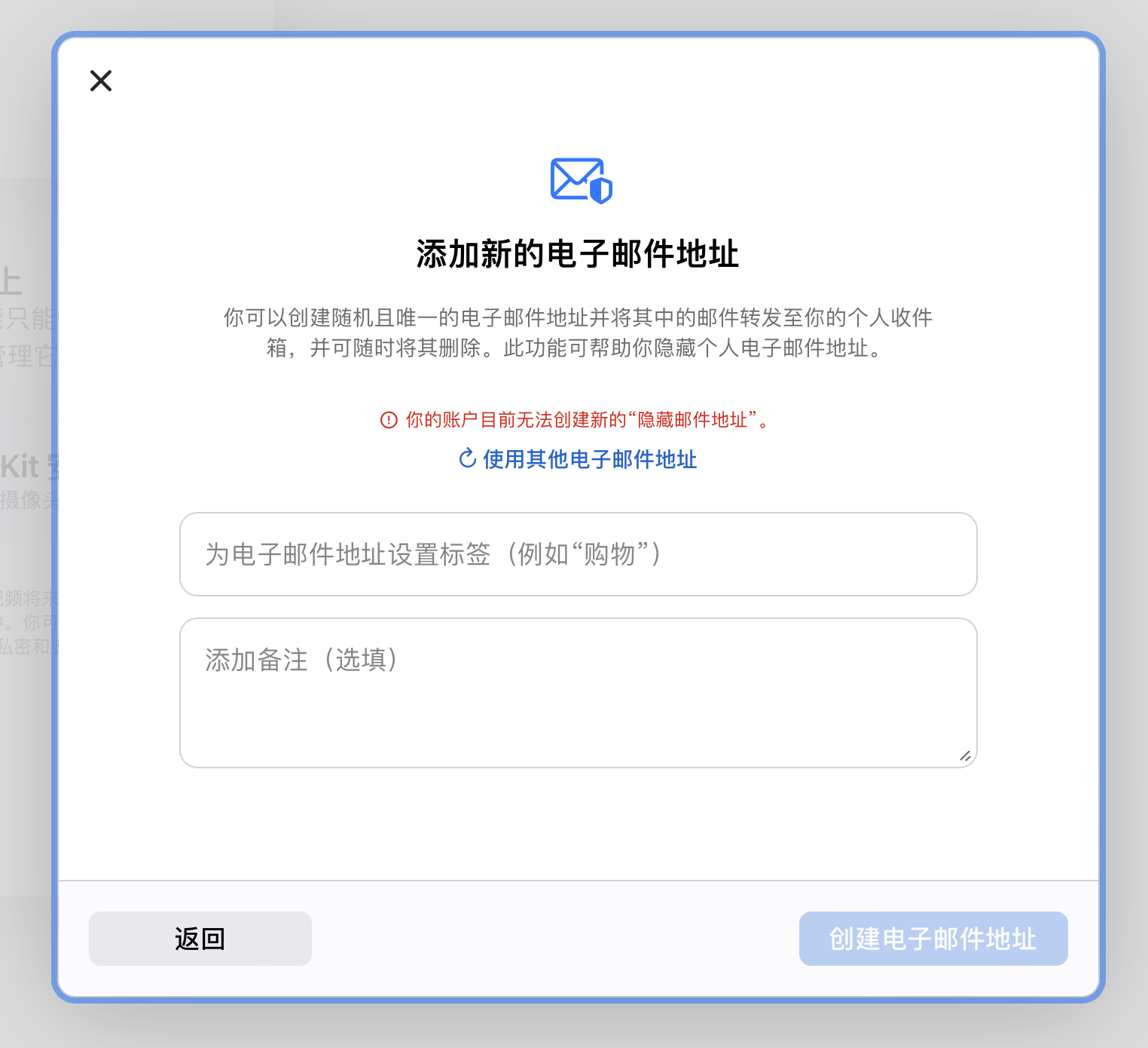 当时是用手机注册的,且并没有生成icloud邮箱。现在我想申请一个icloud邮箱,却提示我无法创建