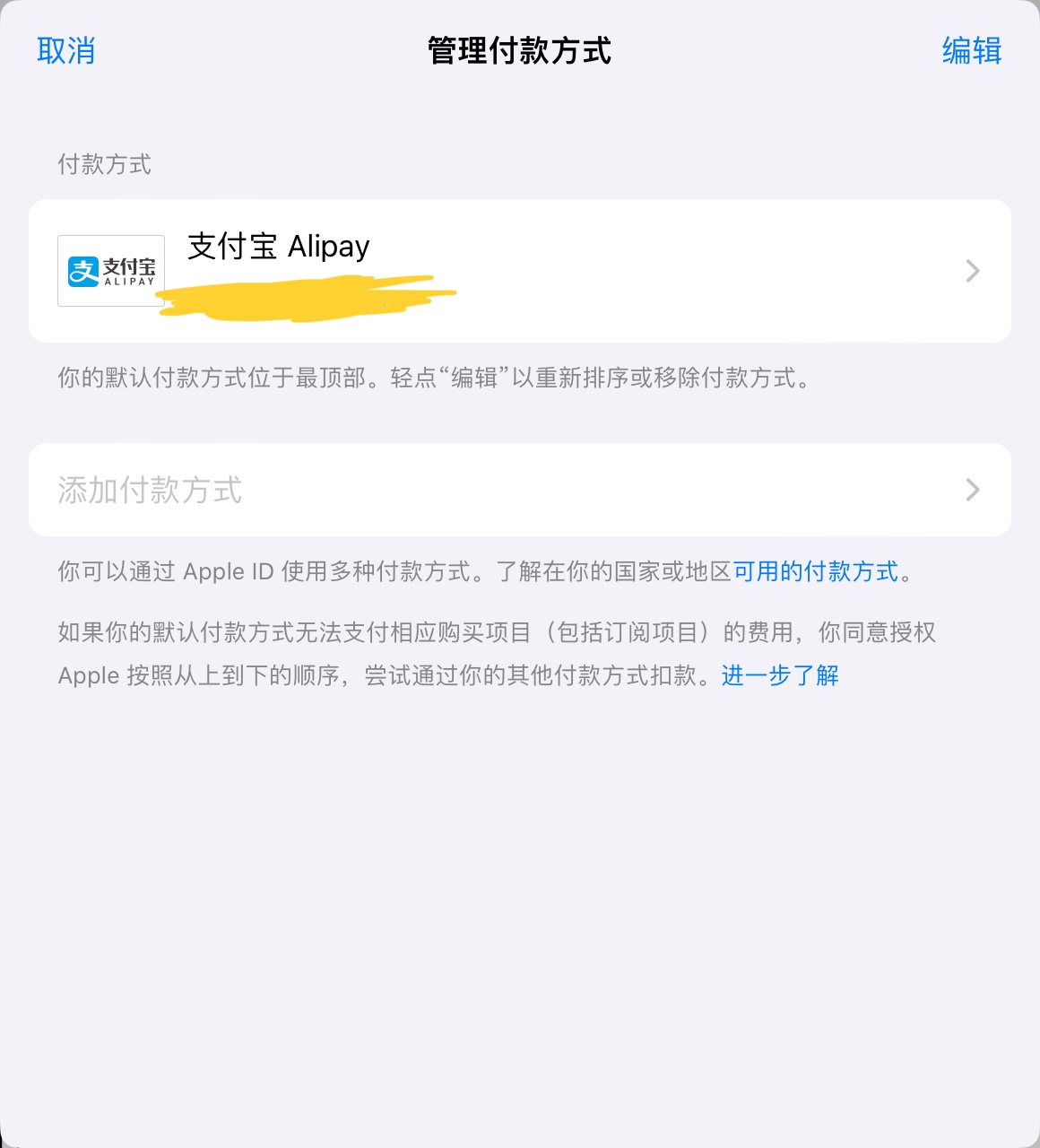 可以尝试在其它登录同一个Apple ID的设备上更改付款方式