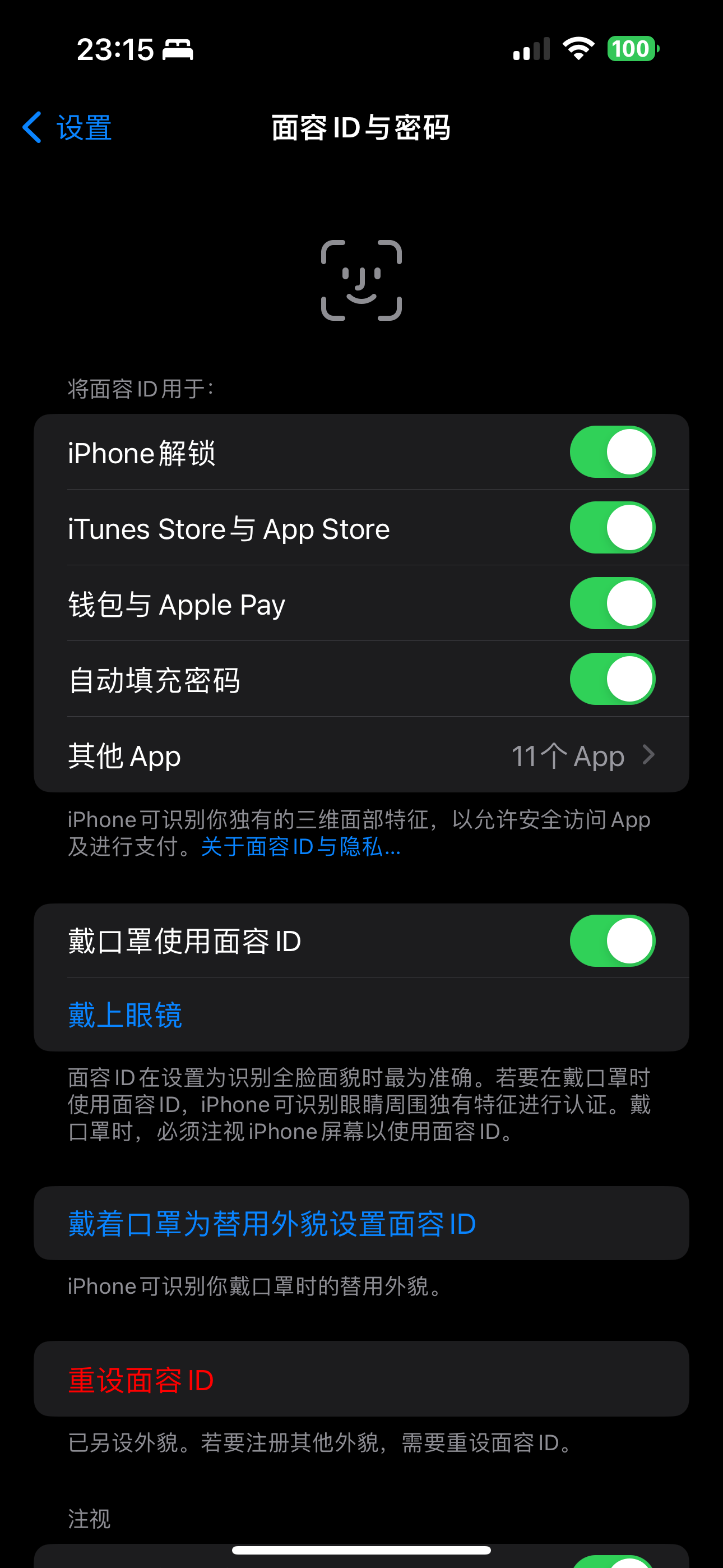 面容ID已启用,所有的功能都打开了,之前一直是正常使用的