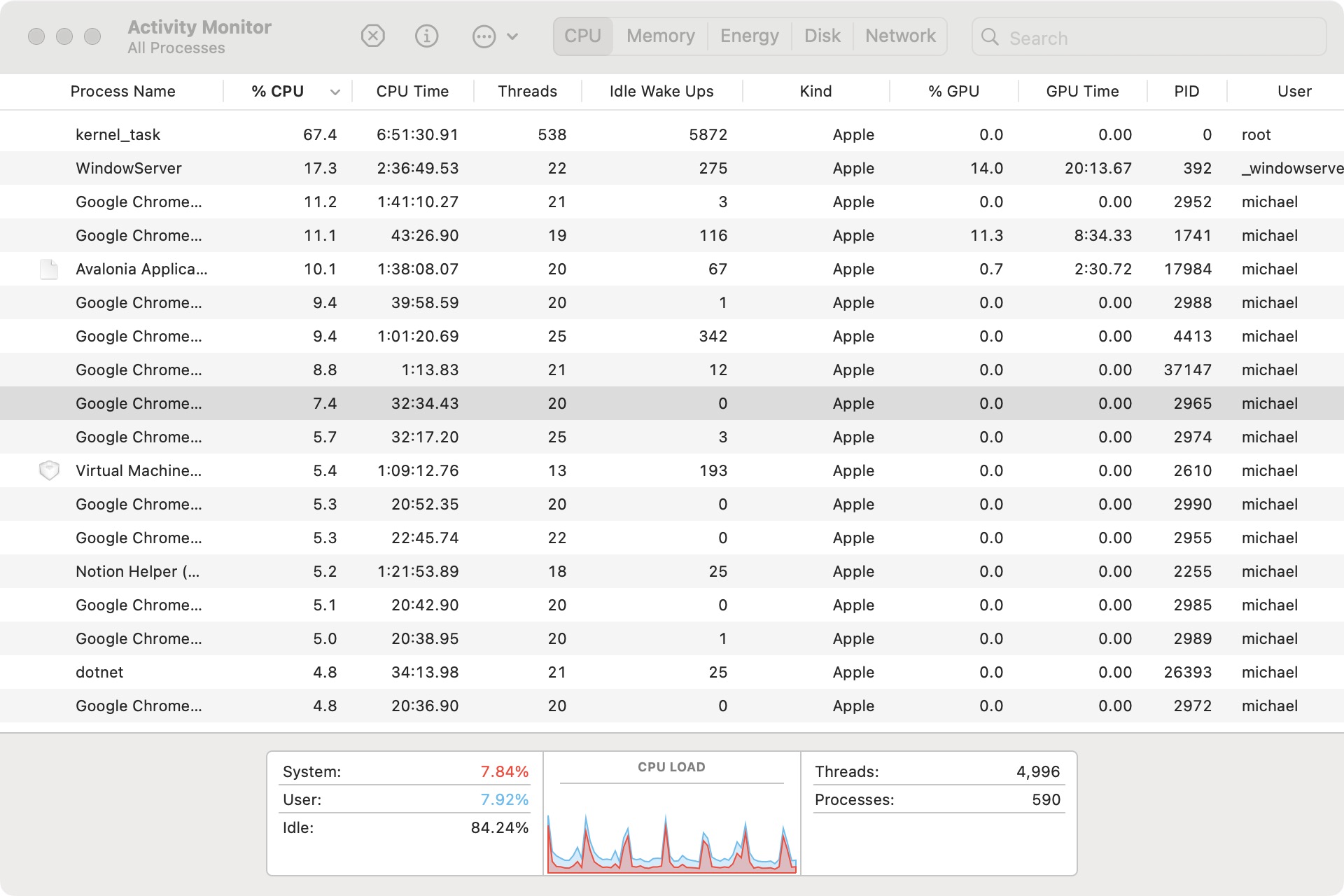 之前几乎就不关机,运行一个星期或者几个星期都不会卡。如果有软件出现异常也很明显就能发现,关闭异常的软件系统就可以恢复正常,某次进行了系统更新之后,系统运行一段时间就会卡顿。而且在活动监视器里面看不到可疑的内容。卡顿出现以后,必须重启系统才可以恢复。