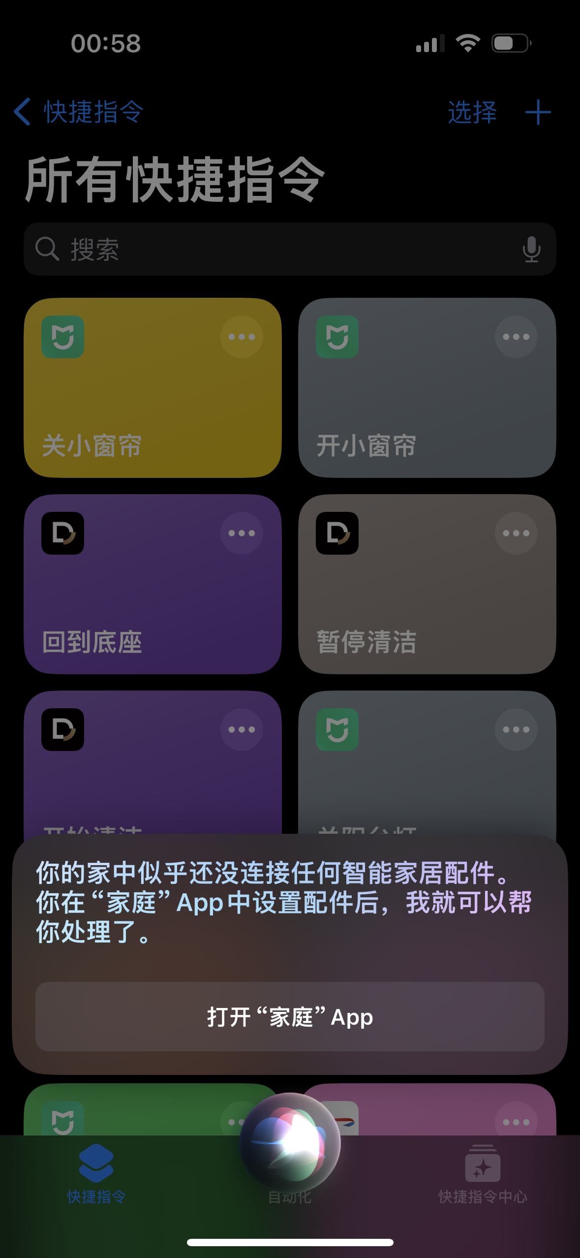 家里有米家窗帘伴侣控制阳台小窗帘和米家开关控制台灯,在米家app中设置了开关窗帘和灯的快捷指令并同步到Siri。每次呼叫Siri比如开窗帘或者关窗帘,有很大几率开关窗帘指令被系统劫持提示家中没有智能设备要求转去”家庭“App配置进而无法继续执行米家app的快捷指令。