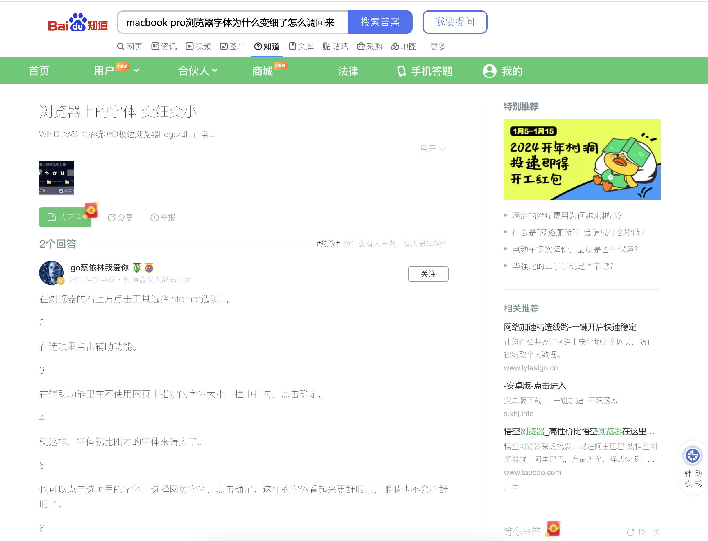 macbook pro浏览器的字体变细了,百度了也查不到,求解答,以下是电脑型号和浏览器字体效果