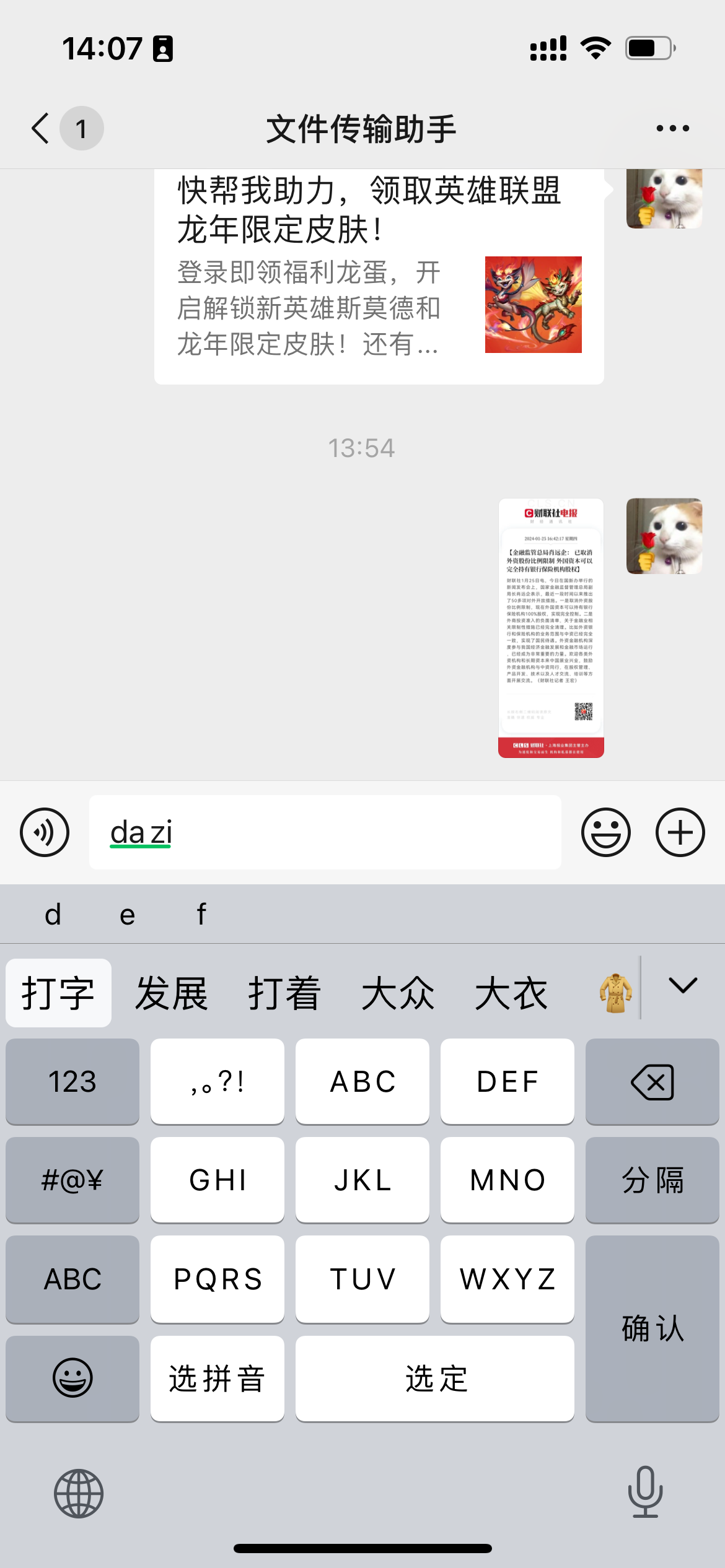 设备iPhone 13,在微信中使用九宫格打字时,备选拼音栏显示不全,如图所示,我输入da'zi时,拼音备选框只显示d,e,f三个可选拼音。另外,日常打字经常会出现按下去拼音,但是全是类似于“”①②③④”之类,带圆圈的数字。