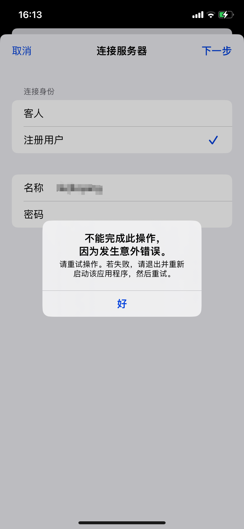 iPhone “连接服务器”页面,显示“不能完成此操作因为发生意外错误”