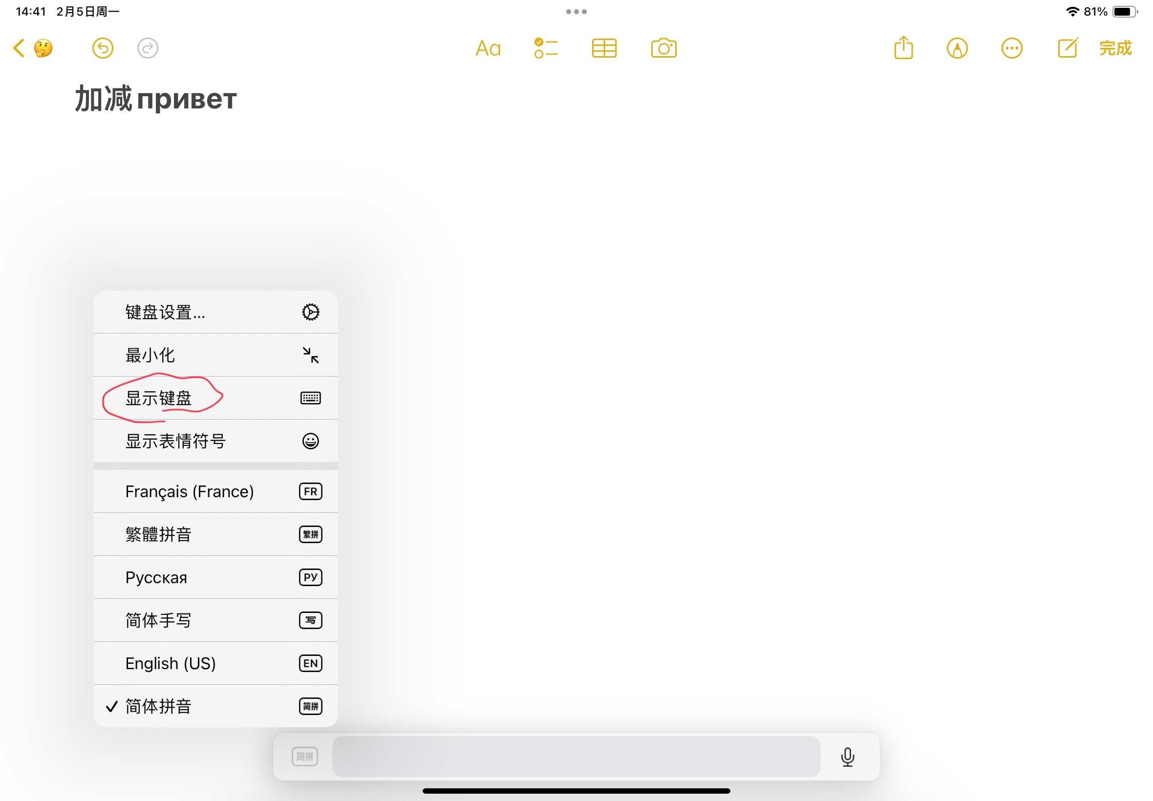 - 问题具体描述: 蓝牙键盘上用control+空格键切换中英文没有问题,但用control+空格键从俄文键盘(不知道其他语种键盘是否也存在此类问题)切换回中文键盘后,输入拼音汉字依旧显示俄文字母,我只能在iPad上选择“显示键盘”,用手指触屏点按几个拼音后,回到蓝牙键盘输入拼音才恢复正常,不知该如何解决,这个问题很影响切换输入不同语言文本的效率。