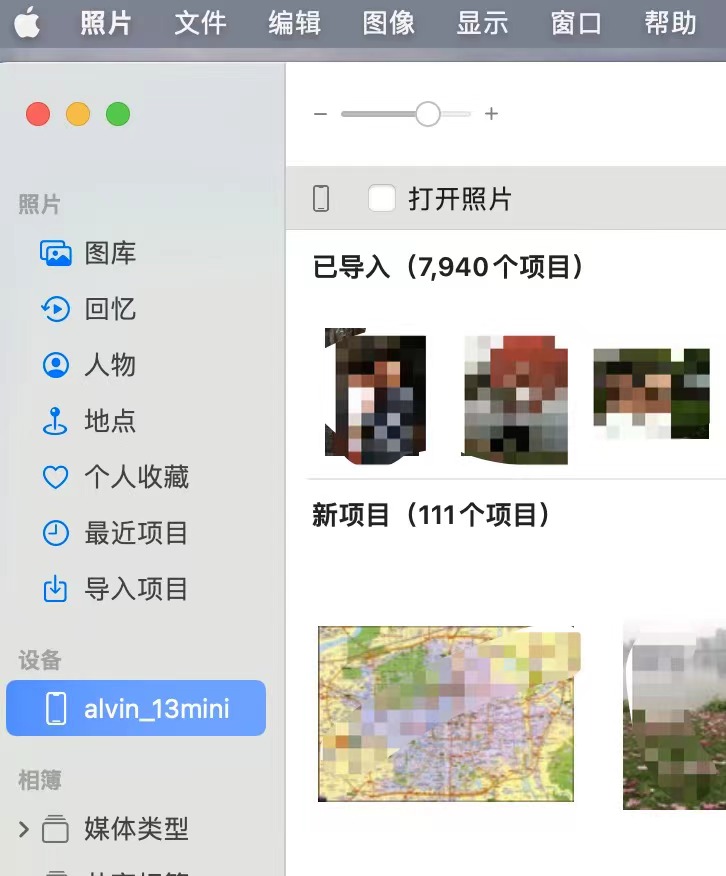iPhone 13 mini,通过mac电脑导入照片到图库。图库设置在外接移动硬盘上的(打开照片app前按住Option键,再指定位置到移动硬盘)。