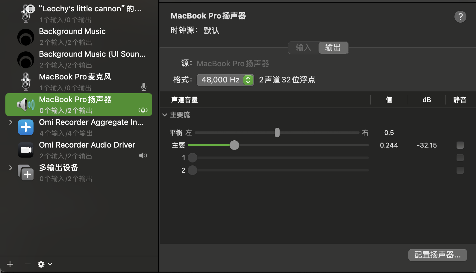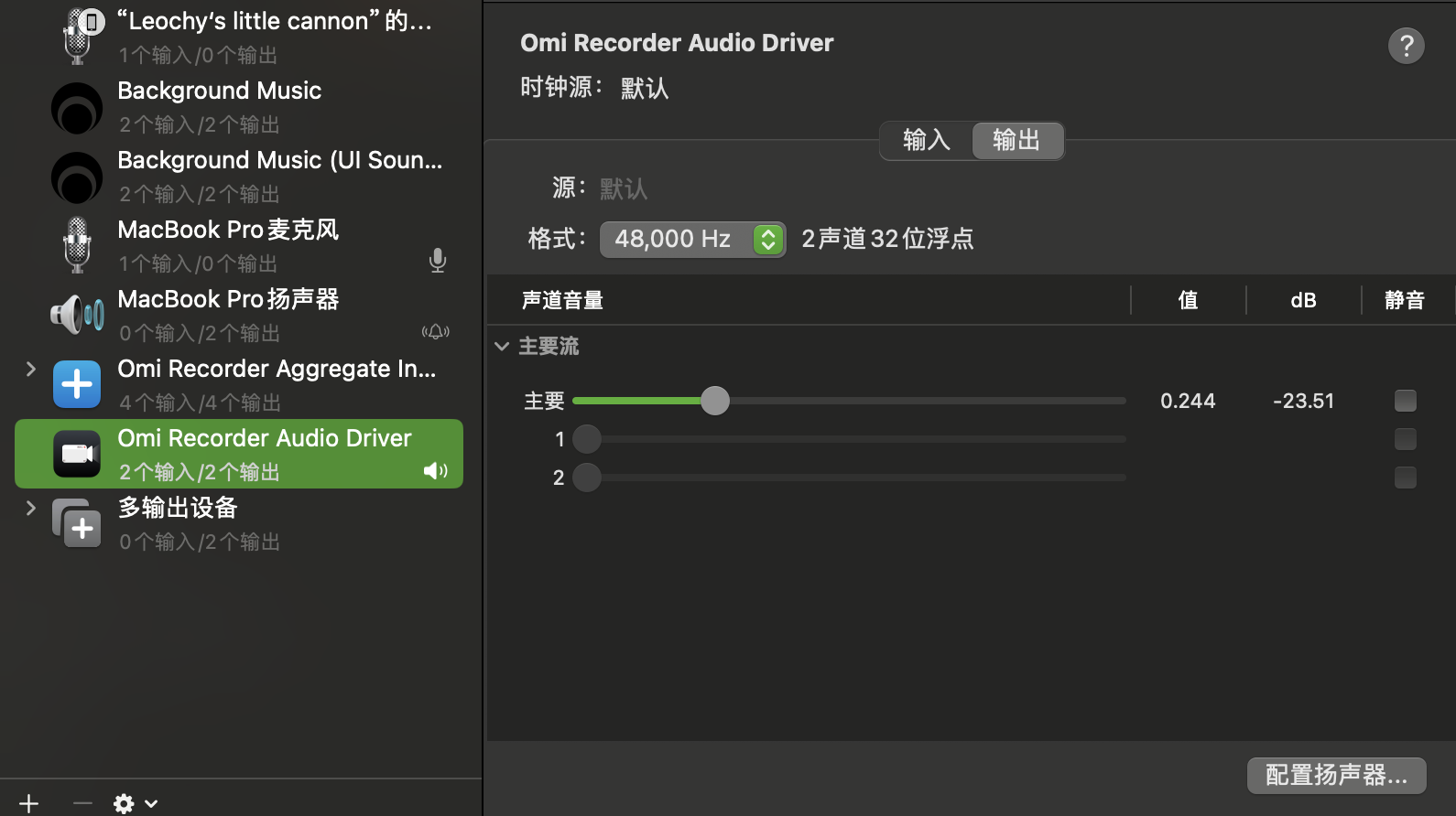 下面附上“音频MIDI设置”中“系统扬声器”和“Omi Recorder Audio Driver”的设置界面,以展示系统扬声器并未更改设置。推测为系统问题。