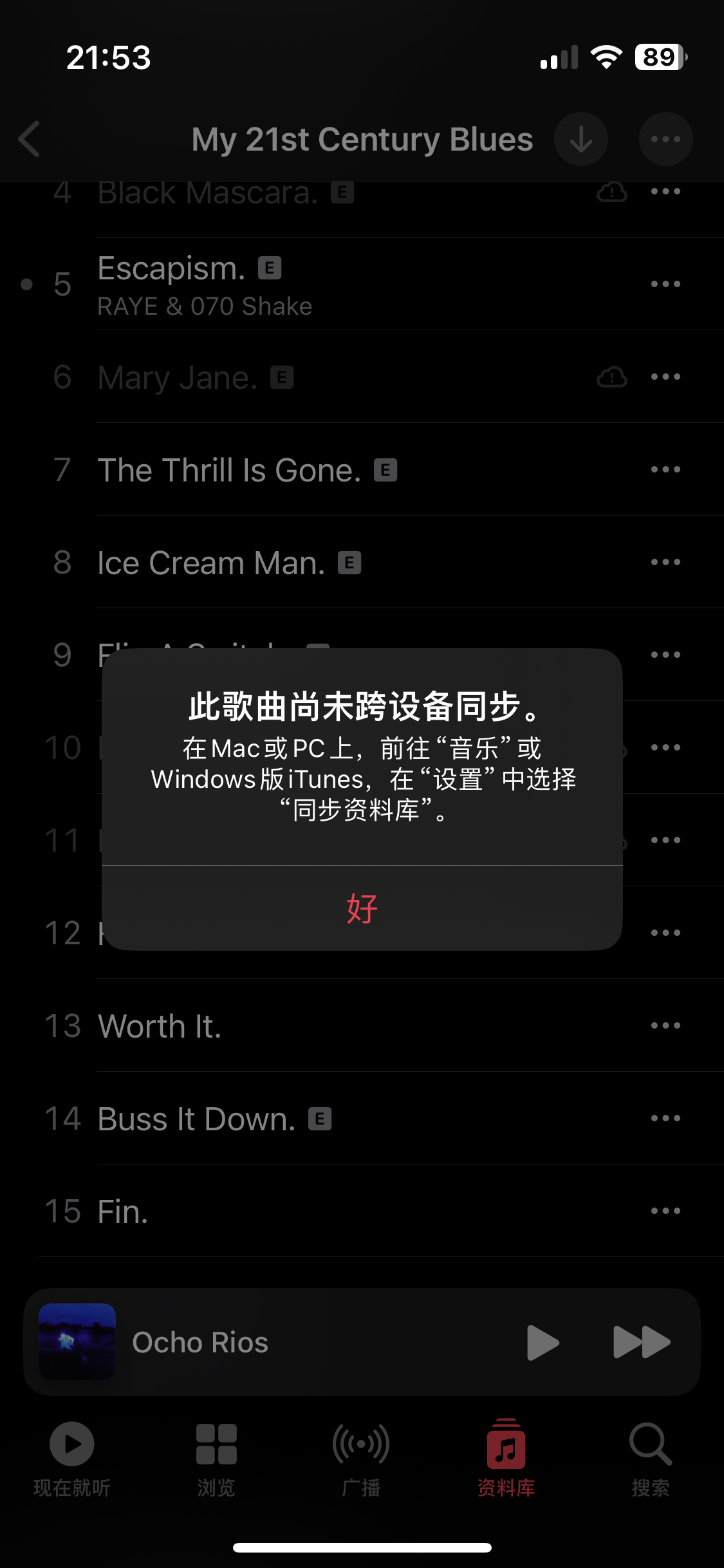 当天上午仍可正常播放的歌曲“Raye-Environmental Anxiety.”,傍晚时在我的资料库内颜色变灰,并出现iCloud小标志,点击时显示“此歌曲尚未跨设备同步”。在按照其提示在Mac的音乐中选择同步资料库后仍无法播放。