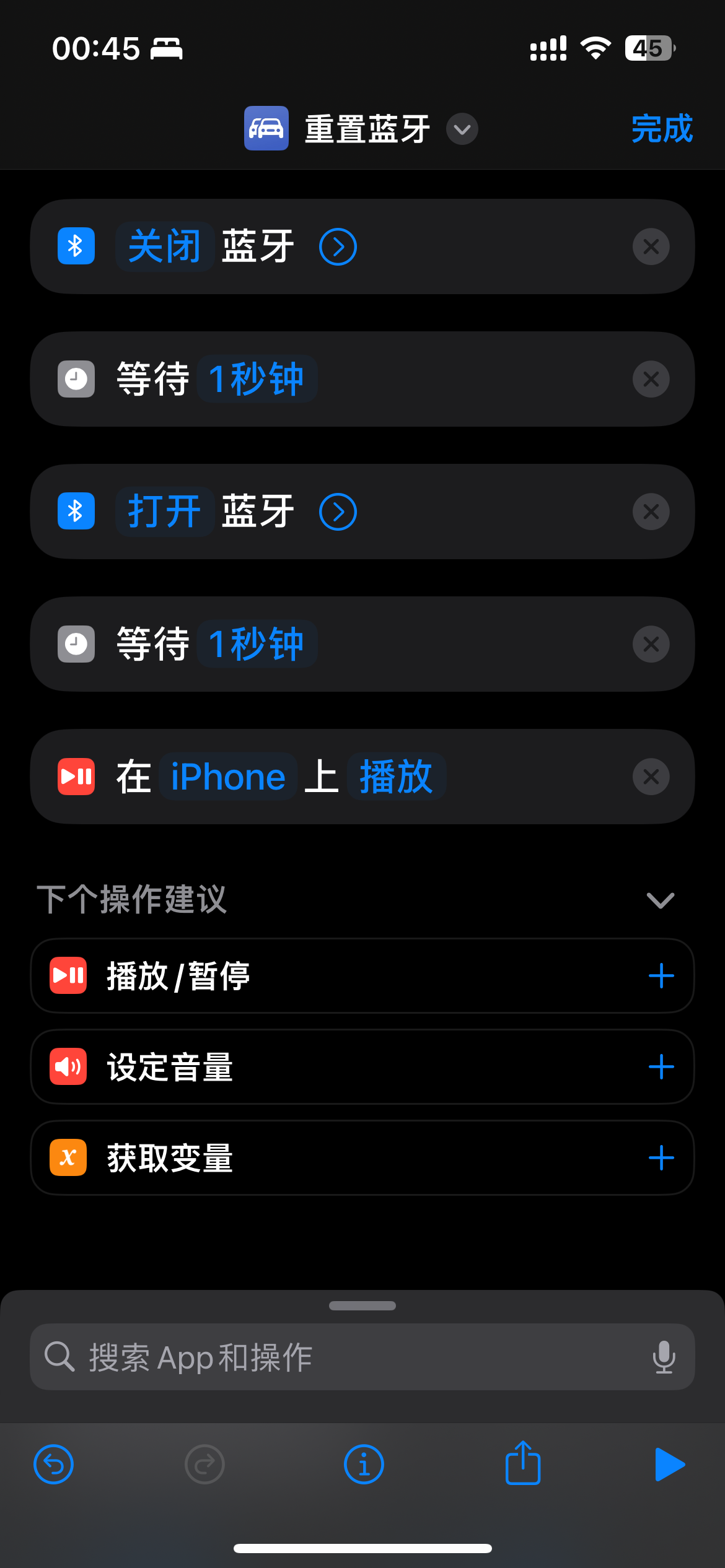 快捷指令命令如图。此快捷指令可以手动运行,但是Siri运行就会卡在关闭蓝牙的状态