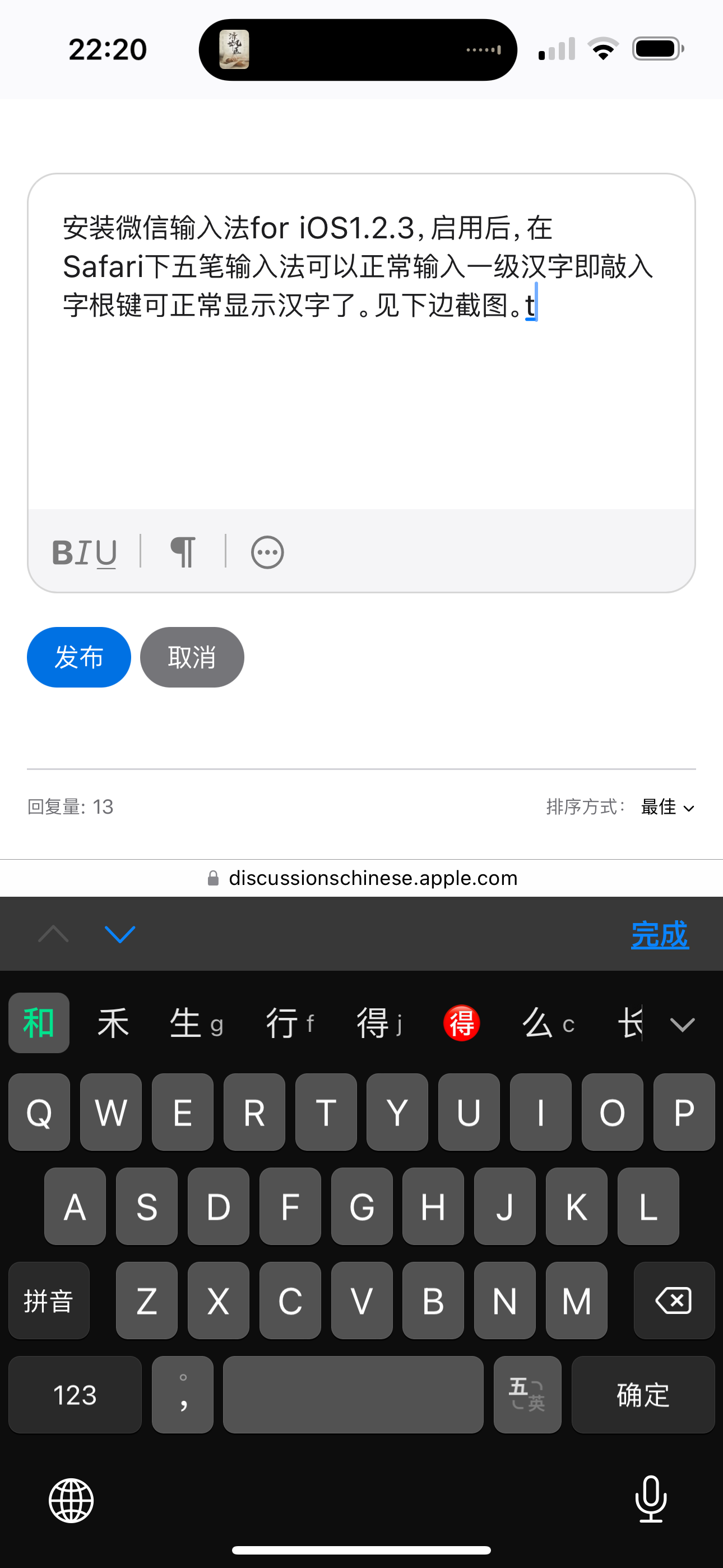 安装微信输入法for iOS1.2.3,启用后,在Safari下五笔输入法可以正常输入一级汉字即敲入字根键可正常显示汉字了。见下边截图。