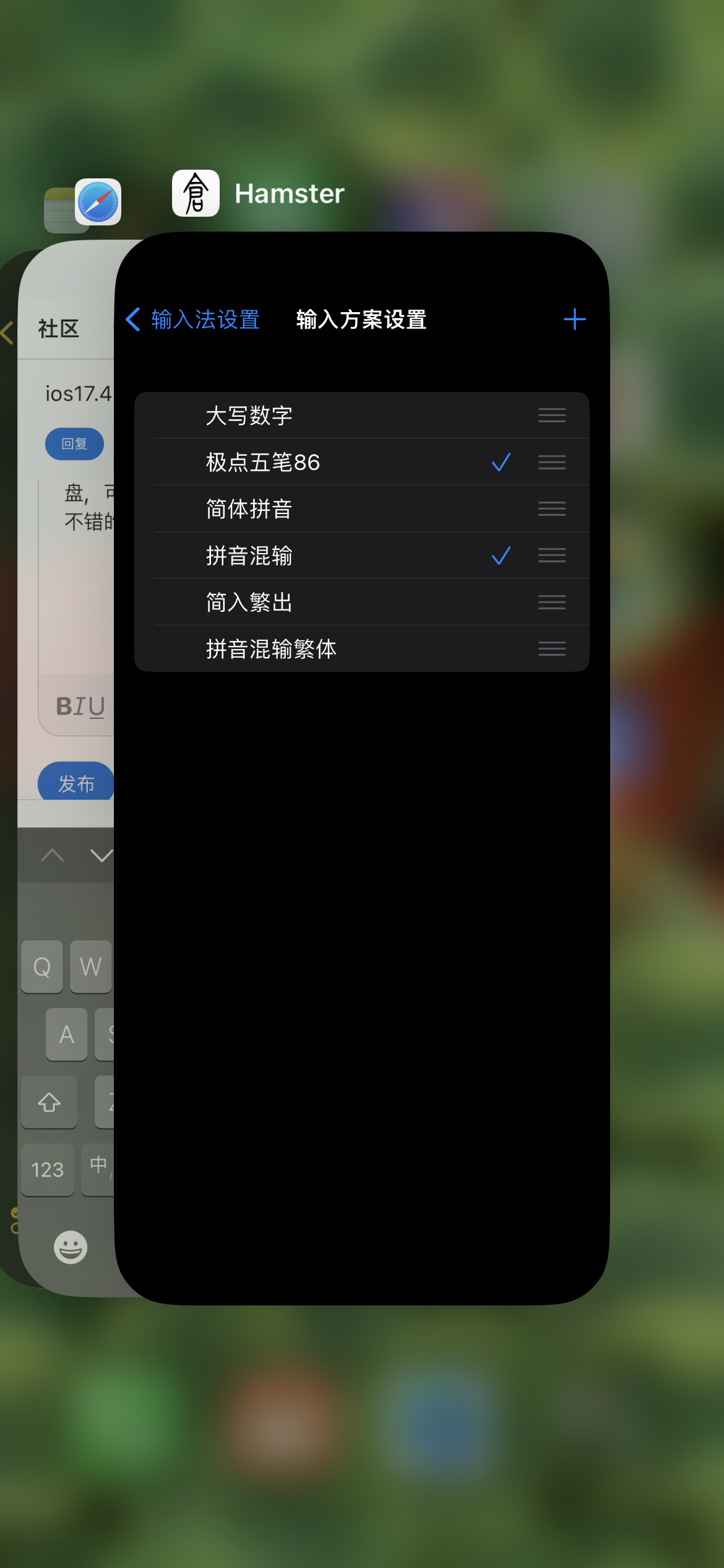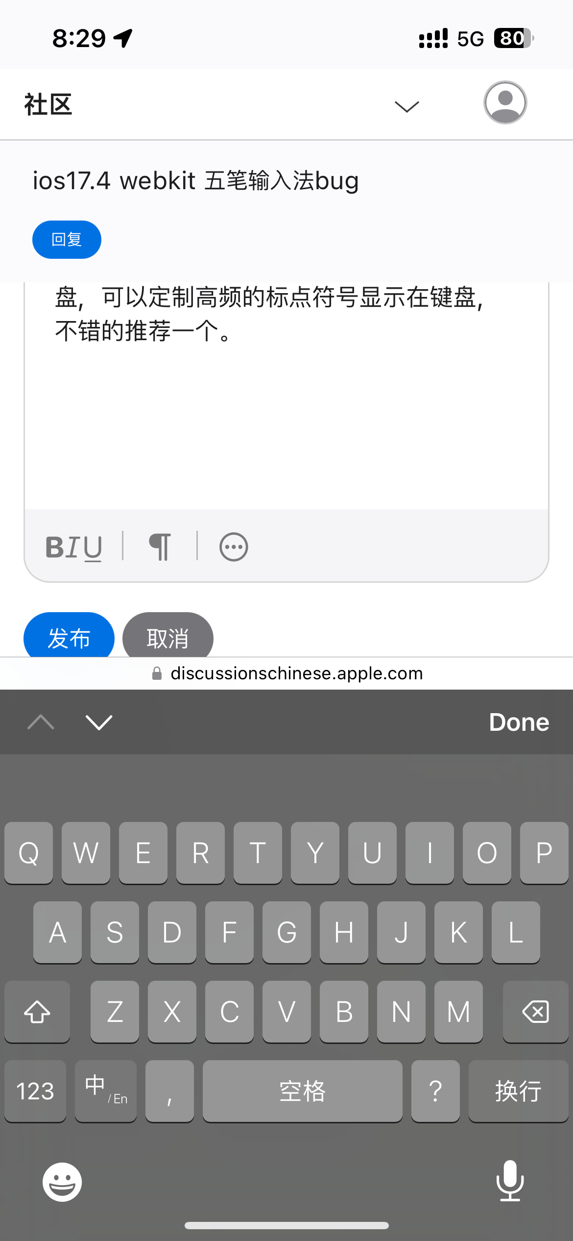 chrome和safari打开的网页中输入框都无法使用五笔输入法的一级简码,也就是只按一个键就能确定的字。自从更新了ios17.4就不能用了。我看到有人发贴说知乎app也不能正常使用五笔,所以猜测是webkit的八阿哥。