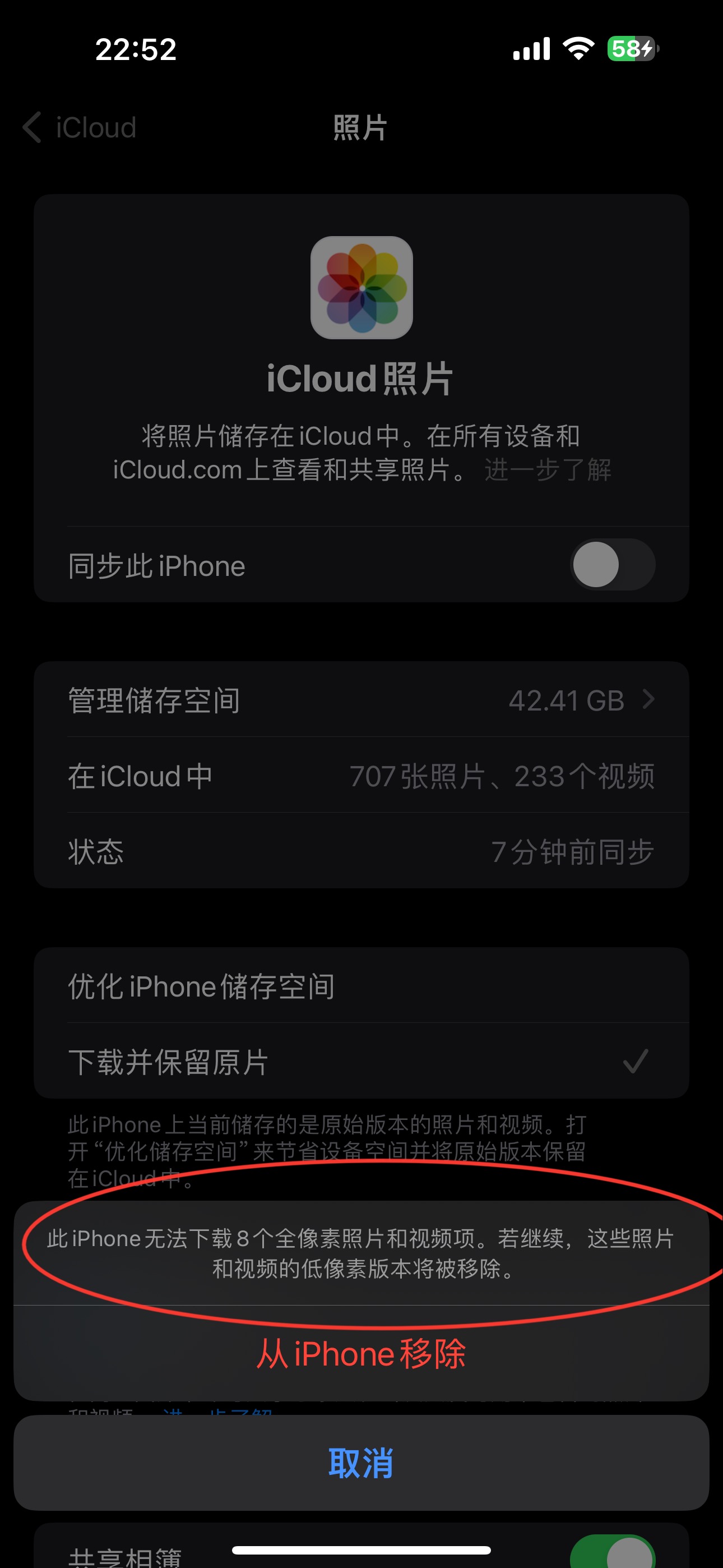 在关闭照片同步时会提示有八张相片无法下载,那么怎么才能把那八张照片下载?无法下载的原因是什么? 试过重启,试过重新开启关闭同步,网络没问题,电量没问题。