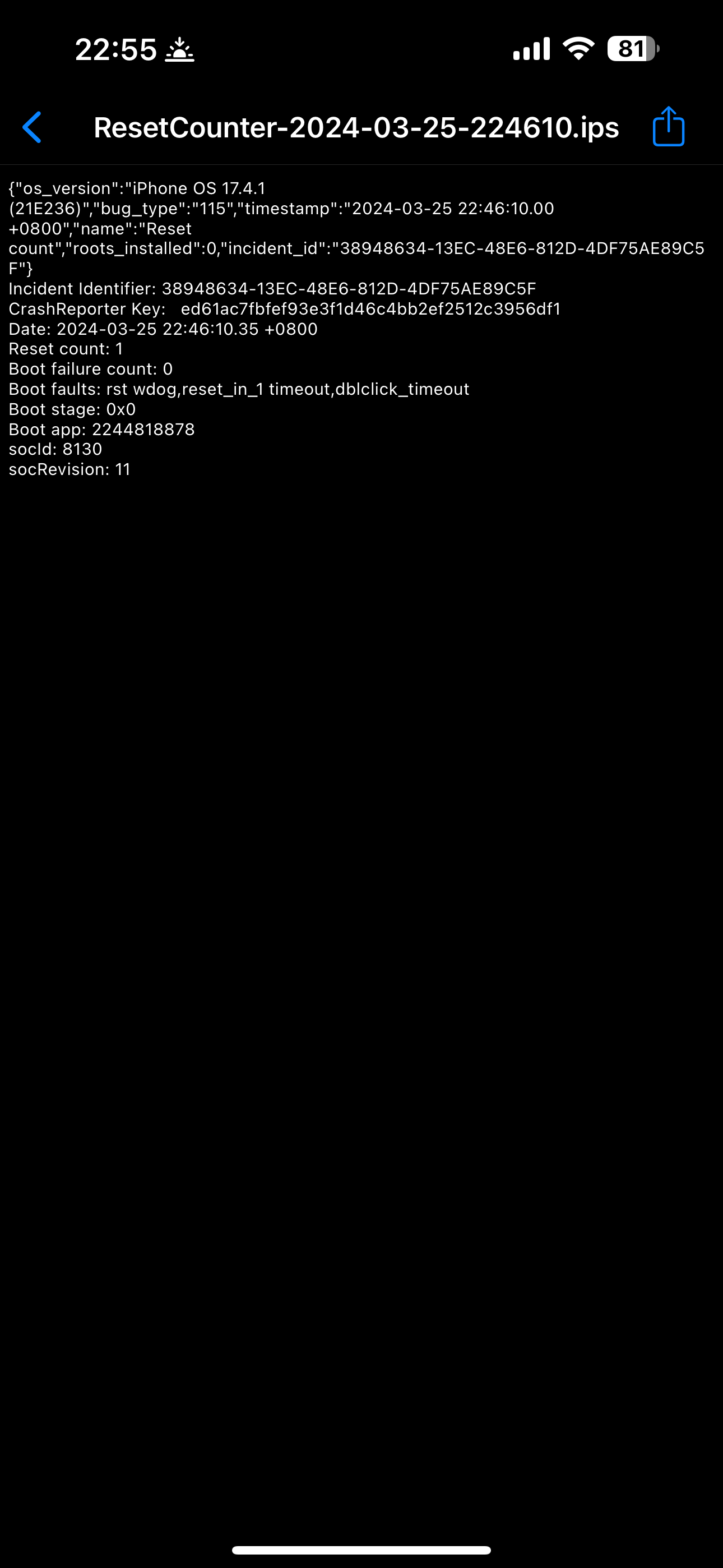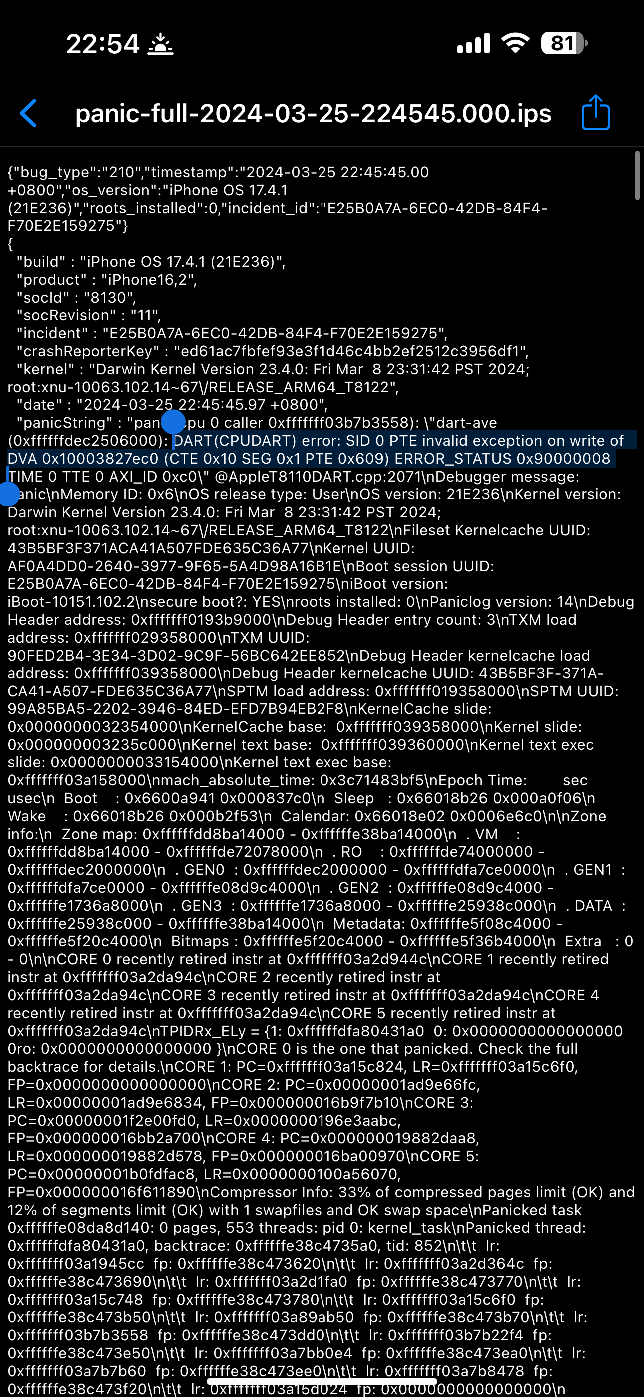 如题,我于2023年12月购买的iPhone 15 Pro Max在近期更新到iOS 17.4.1后,从2024年3月23日傍晚起频繁出现黑屏自动关机、重启的现象。在寻找了“分析与数据”中的系统日志后,我发现了众多的“panic-full”文件与“ResetCounter”文件,如下图: