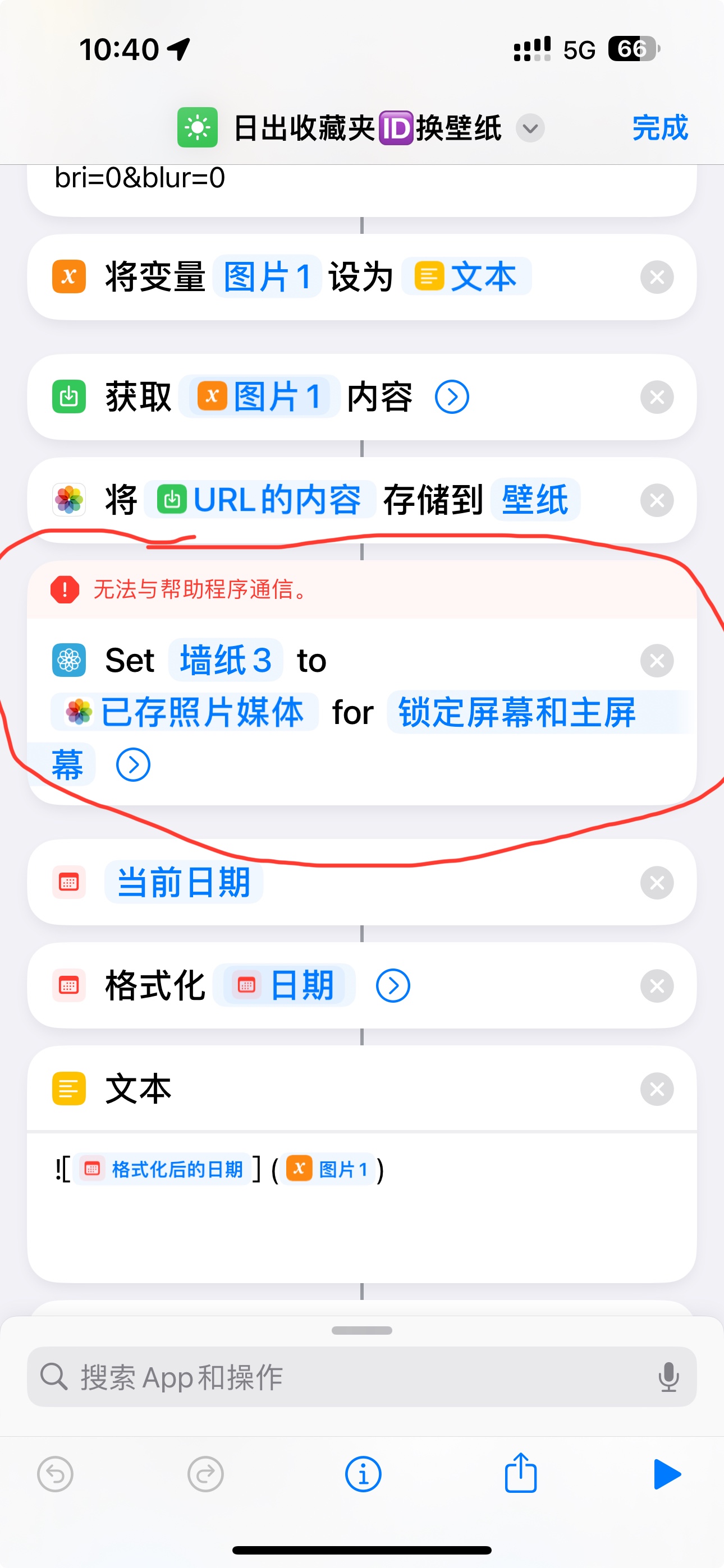 问题:连续多次执行快捷指令后,快捷指令有一定概率在设置墙纸那一行命令处报“无法与帮助程序通信”的错误