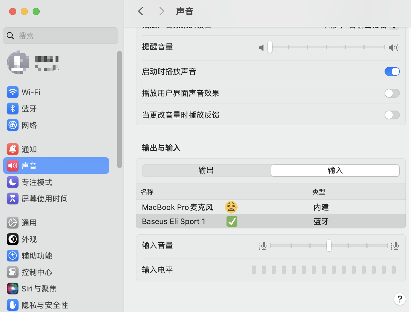 2. 在声音设置中将“输入”选择为蓝牙耳机并保持声音设置窗口开启。一但关闭声音设置窗口或者将输入选择为 "Macbook Pro 麦克风" 卡顿会立即复现。