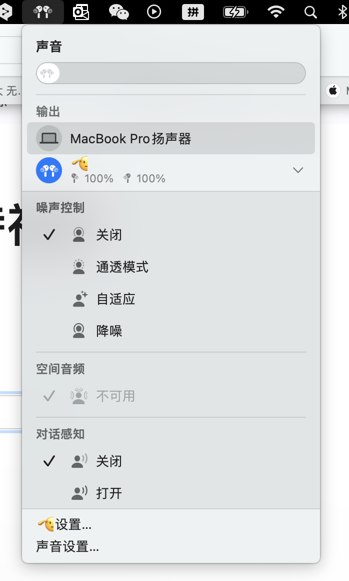 AirPods pro2连MacBook以后声音巨大 无法调节音量 只能在b站或者QQ音乐这类带音量条带地方调节 touch bar或者声音的地方都不能调音量 但是使用其他耳机连电脑没有问题 同一个AirPods连iPhone也没有问题 不知道怎么办了😭