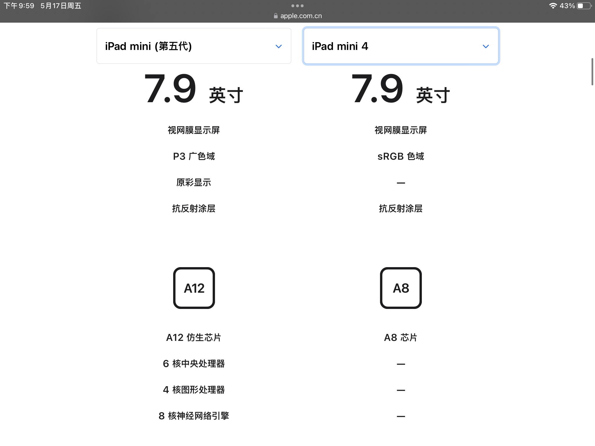 你好,希望你能看到这个回复。iPad Mini 4年代久远,芯片如同iPhone6(没有s)。而iPad Mini 5虽然相隔1代,但是用了A12芯片,如同iPhone Xs Max。
