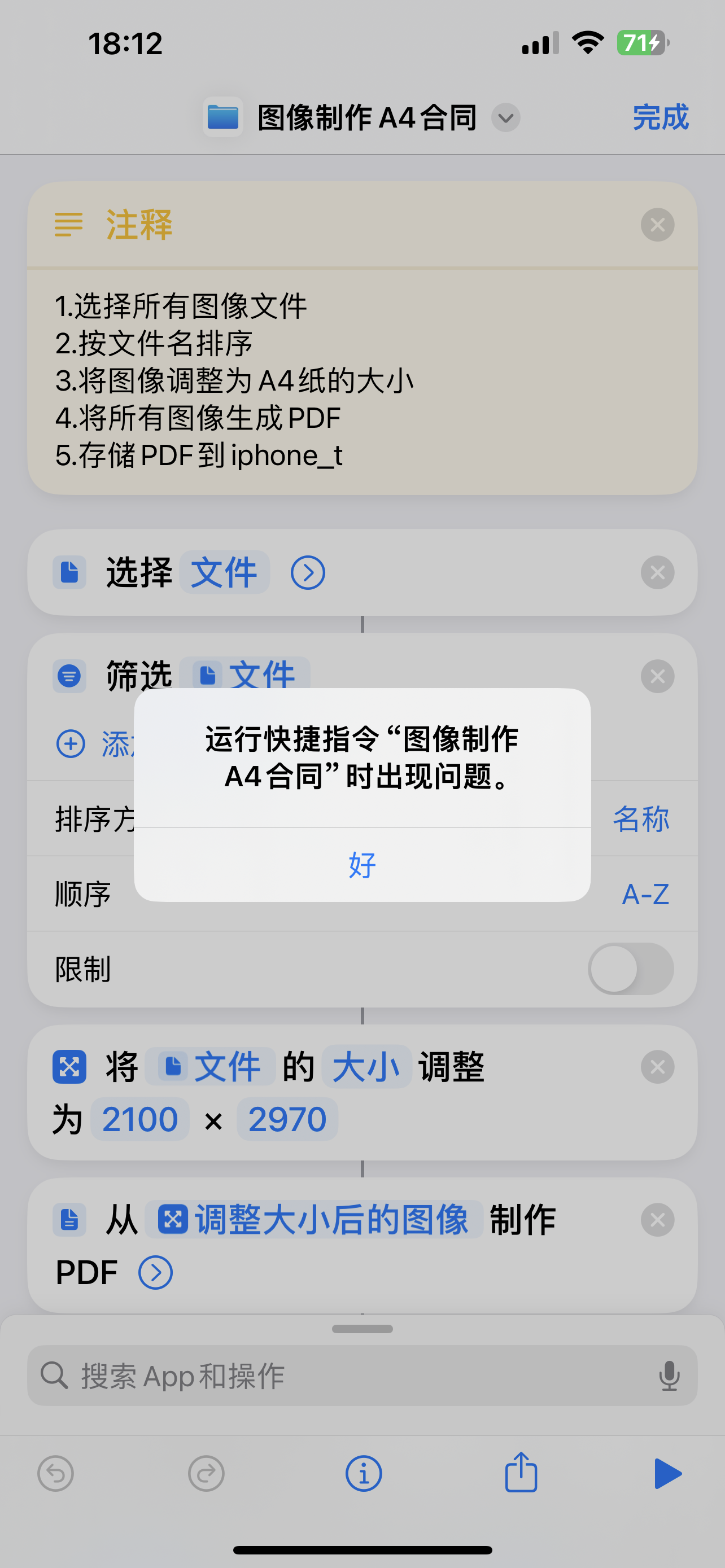 进行一些批量操作时,快捷指令容易报错。比如:批量调整30张图片的尺寸、操作大尺寸图片的时候……