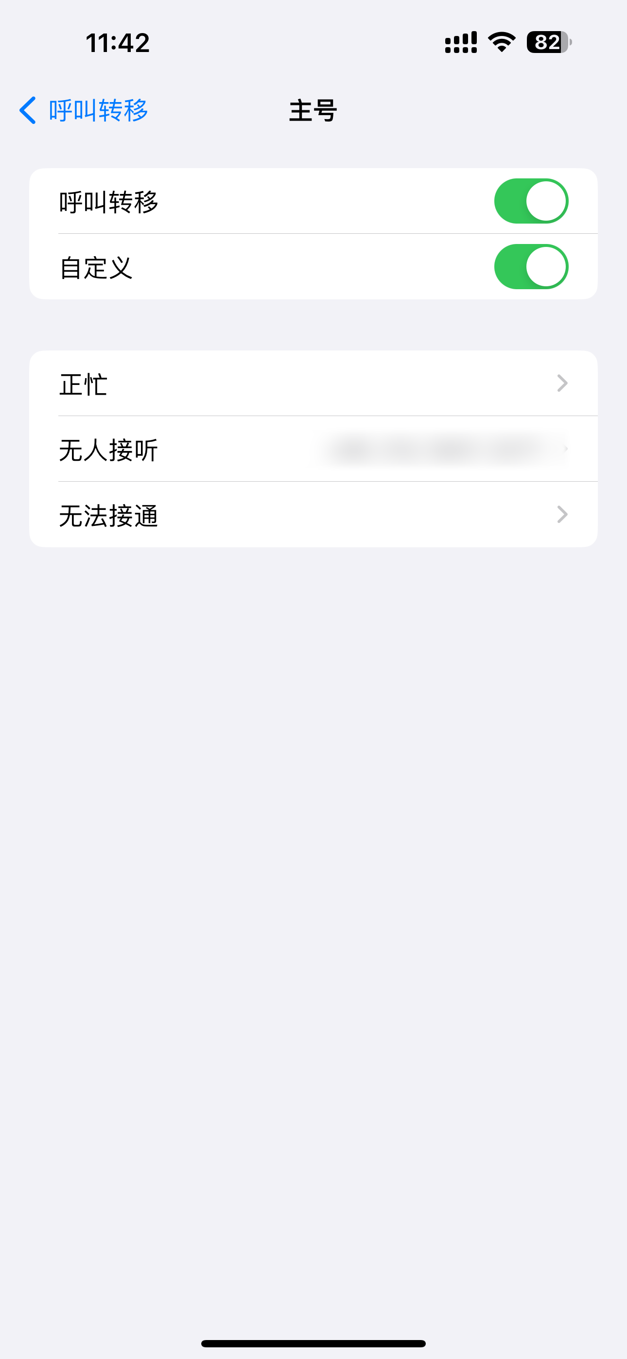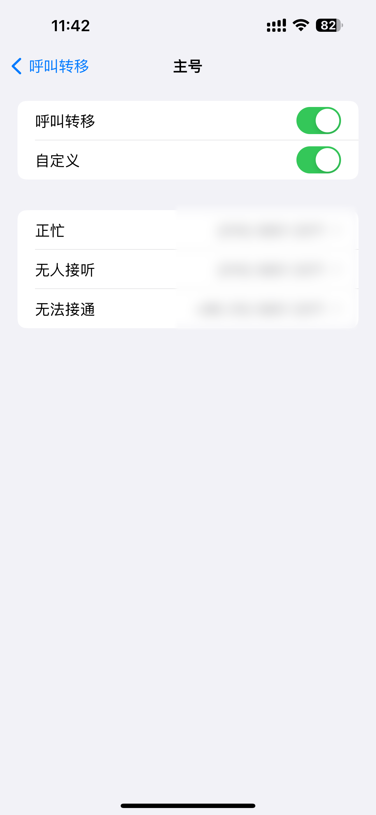 设置呼叫转移自定义,填好之后返回再进去只有一个选项存在,其他选项不存在号码且无法使用呼叫转移