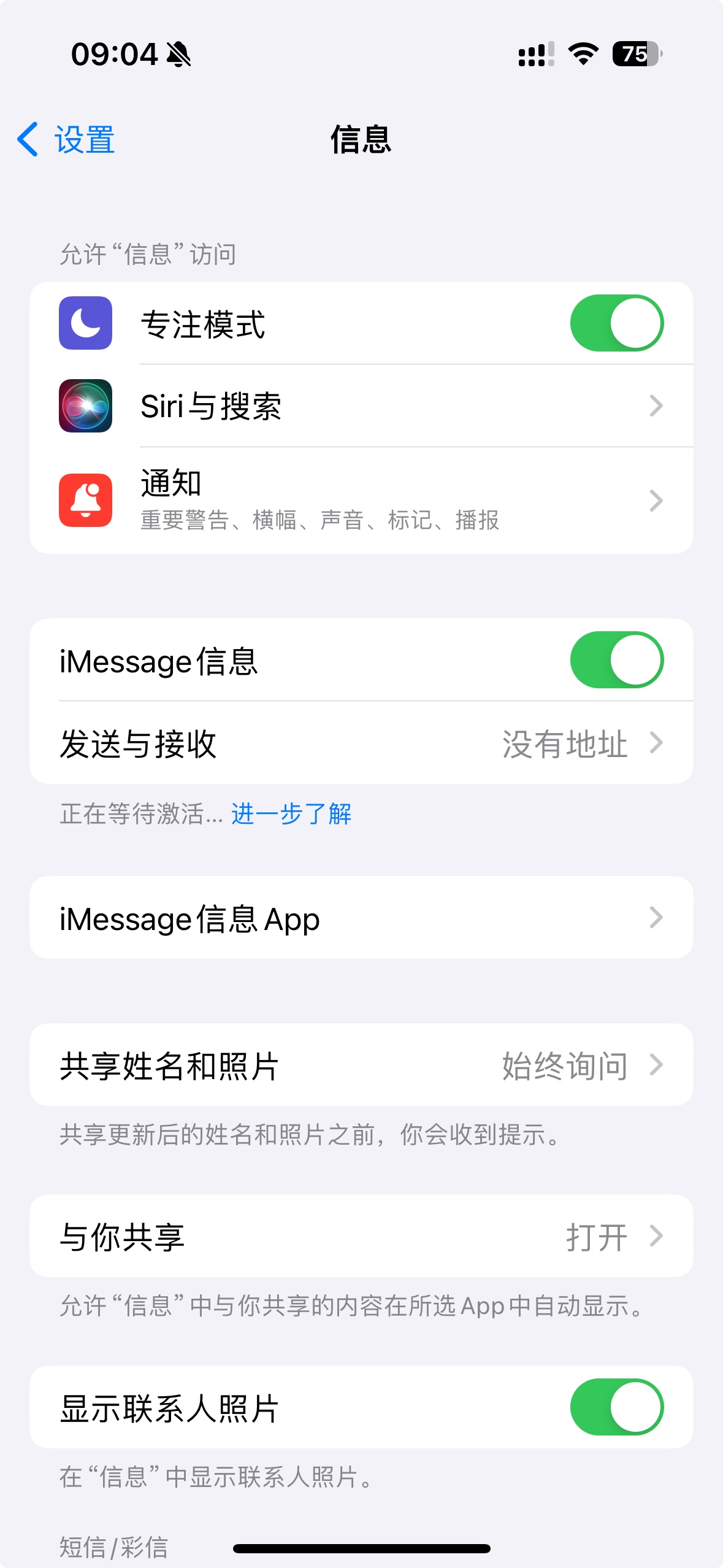 iMessage没有地址而且点进去俩手机号都在转圈,正在等待激活,一直是下面这个状态