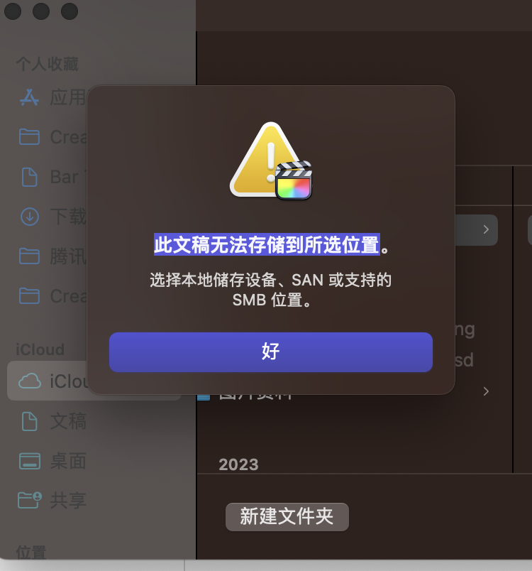 我开启了“文稿”和“桌面”同步的功能,我在文稿中创建了一个文件夹用于剪辑,我把所有的素材都拷贝到其中,在fcpx中创建资源库的时候是无法选择这个存储位置的,提示“此文稿无法存储到所选位置”。