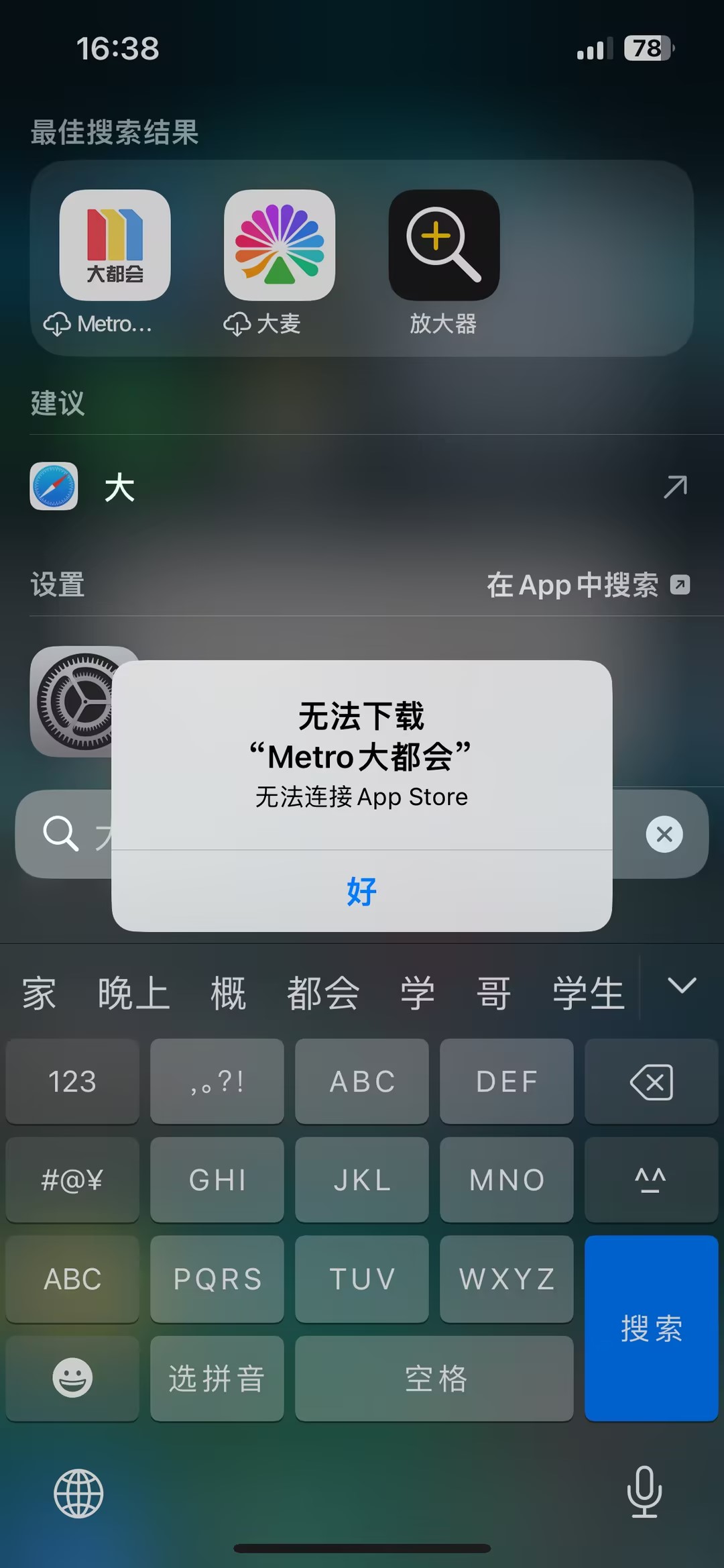 可以看到你测试的这个大都会APP有一个云下载的图标,意思是这个APP并没有实际上在你的iPhone中下载