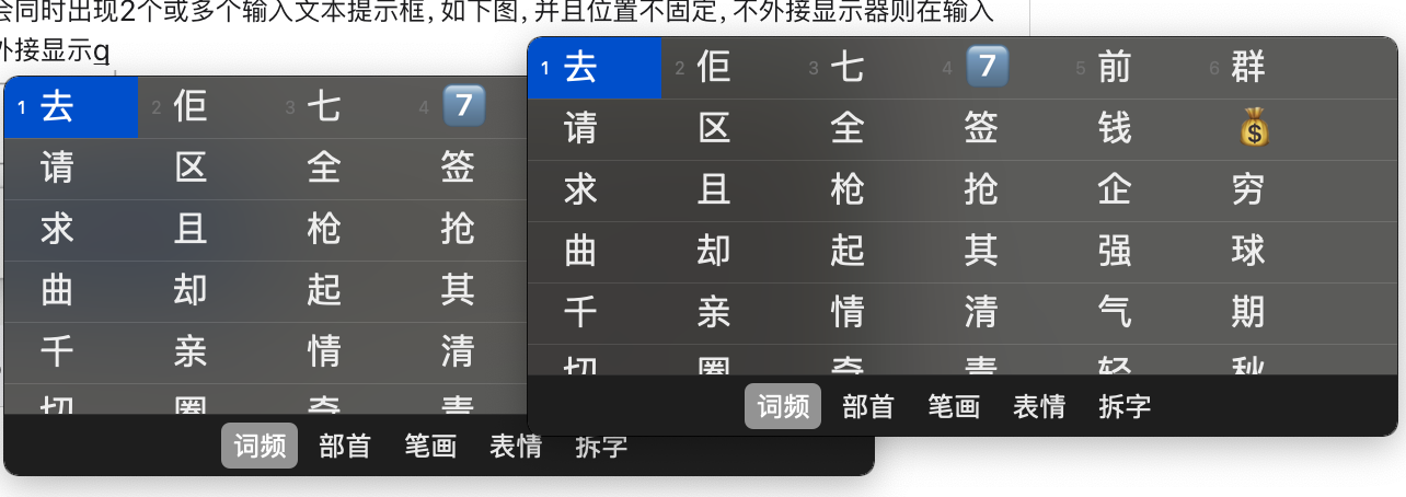 在使用系统默认输入法输入简体中文时,会同时出现2个或多个输入文本提示框,如下图,并且位置不固定,不外接显示器则在输入光标下方和光标所在窗口顶端出现;如果外接显示器则会在两个显示屏幕中来回跳动。