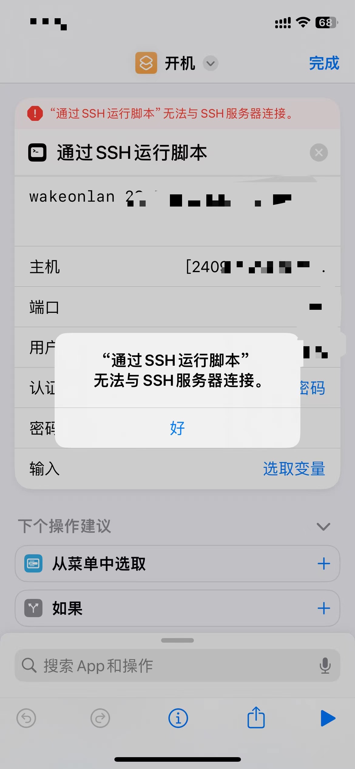 主机和手机均有IPV6地址,在快捷指令APP里”通过SSH运行脚本“里填入IPV6地址,会提示无法与SSH服务器连接,加不加大括号都不行。