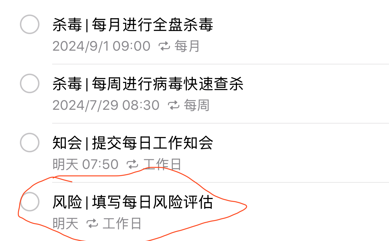 像图中这条事项,在之前我已经设置为了具体的提醒时间为8:00,当我勾选完成今天的事项后,第二天的提醒时间变为了全天事件,会在凌晨00:00提醒我。