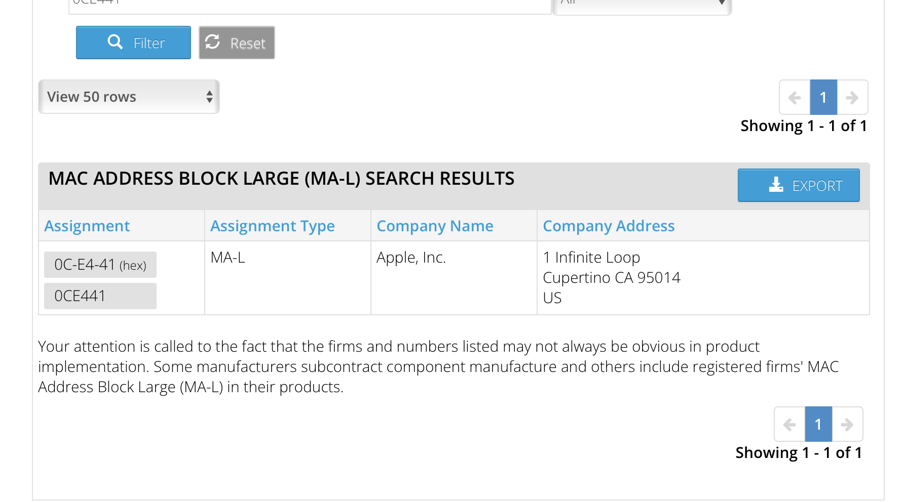 鼠标产品上有序列号,但是在线上查询的话,例如在官网Check Your Service and Support Coverage - Apple Support这里查就没有,并且提示序列号不正确,我也知道这个是最基本在线上查询的方法,之前很多苹果产品序列号都是在这查,唯独鼠标🖱️查不到,但是在https://regauth.standards.ieee.org/standards-ra-web/pub/view.html#registries 查询它地址的前六位可以查询到以下结果