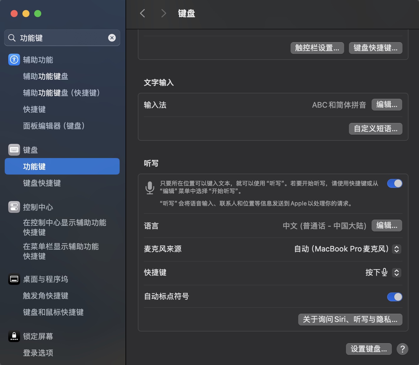 打开系统设置,“键盘”,“键盘快捷键…”,“功能键”来选择开启将功能键作为标准功能键使用。