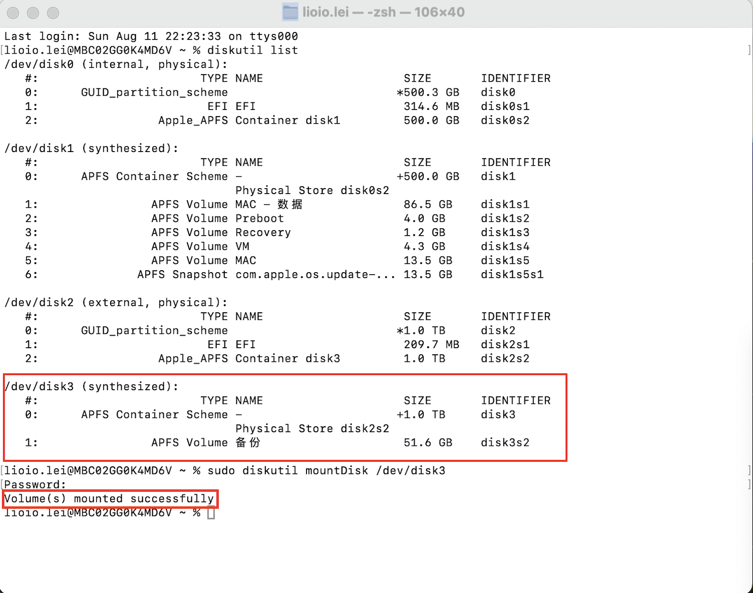 2、跟着网上的一些经验贴在【终端】里输入一些指令,提示 mounted successfully,但还是没显示U盘(disk3)