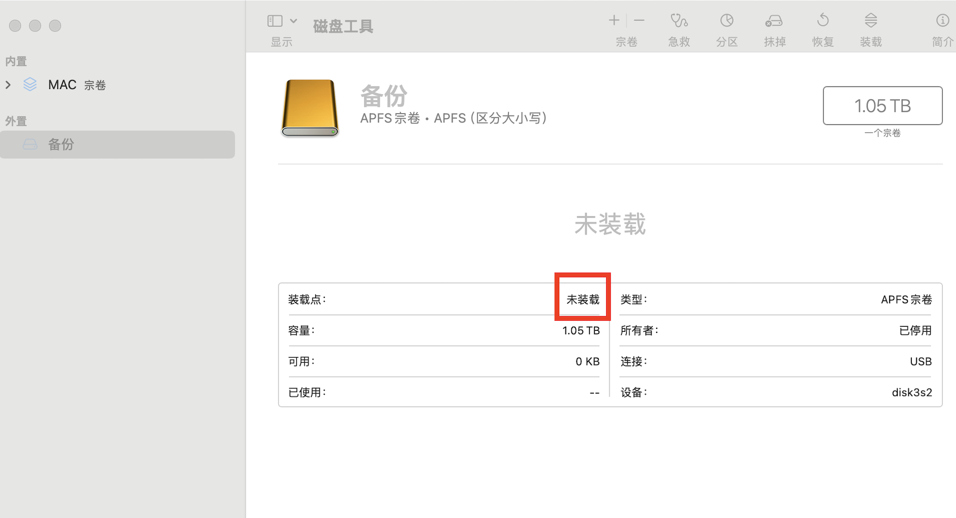 U盘插入macbook后桌面没反应、不显示,在【磁盘工具】中查看是“未装载”状态,目前做过以下尝试都没用: